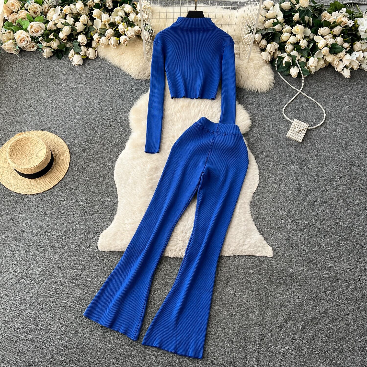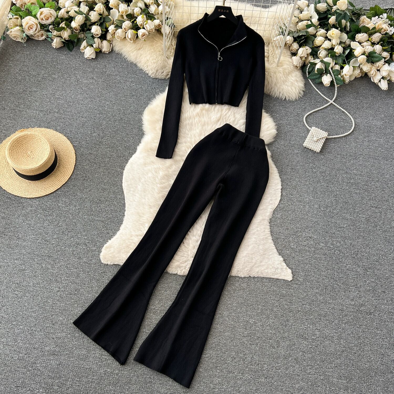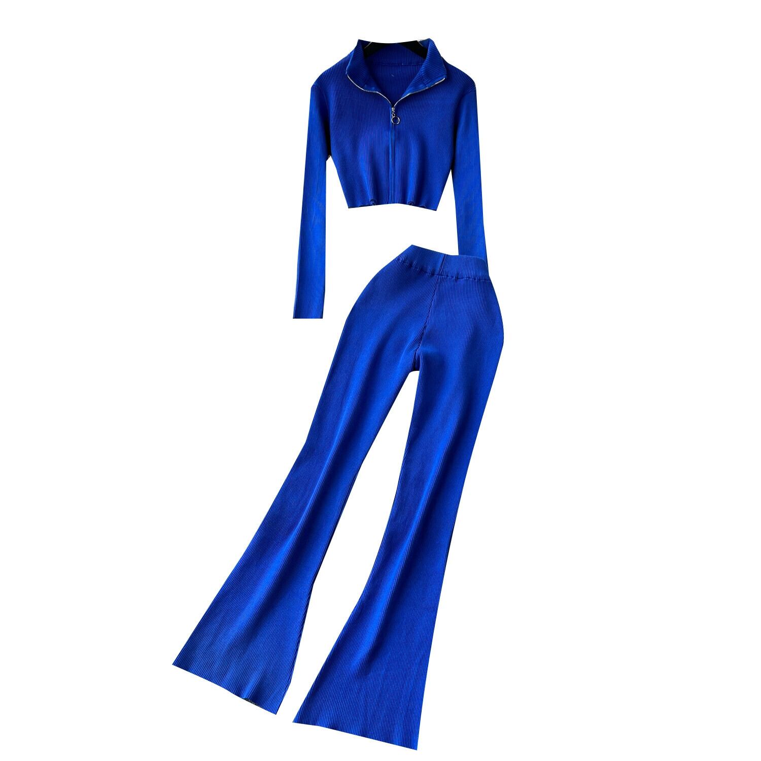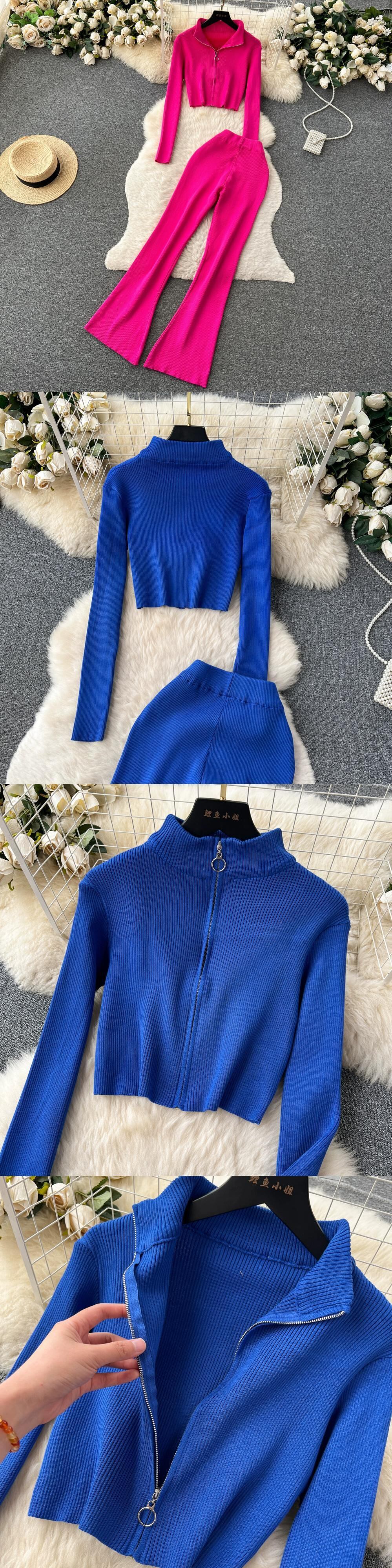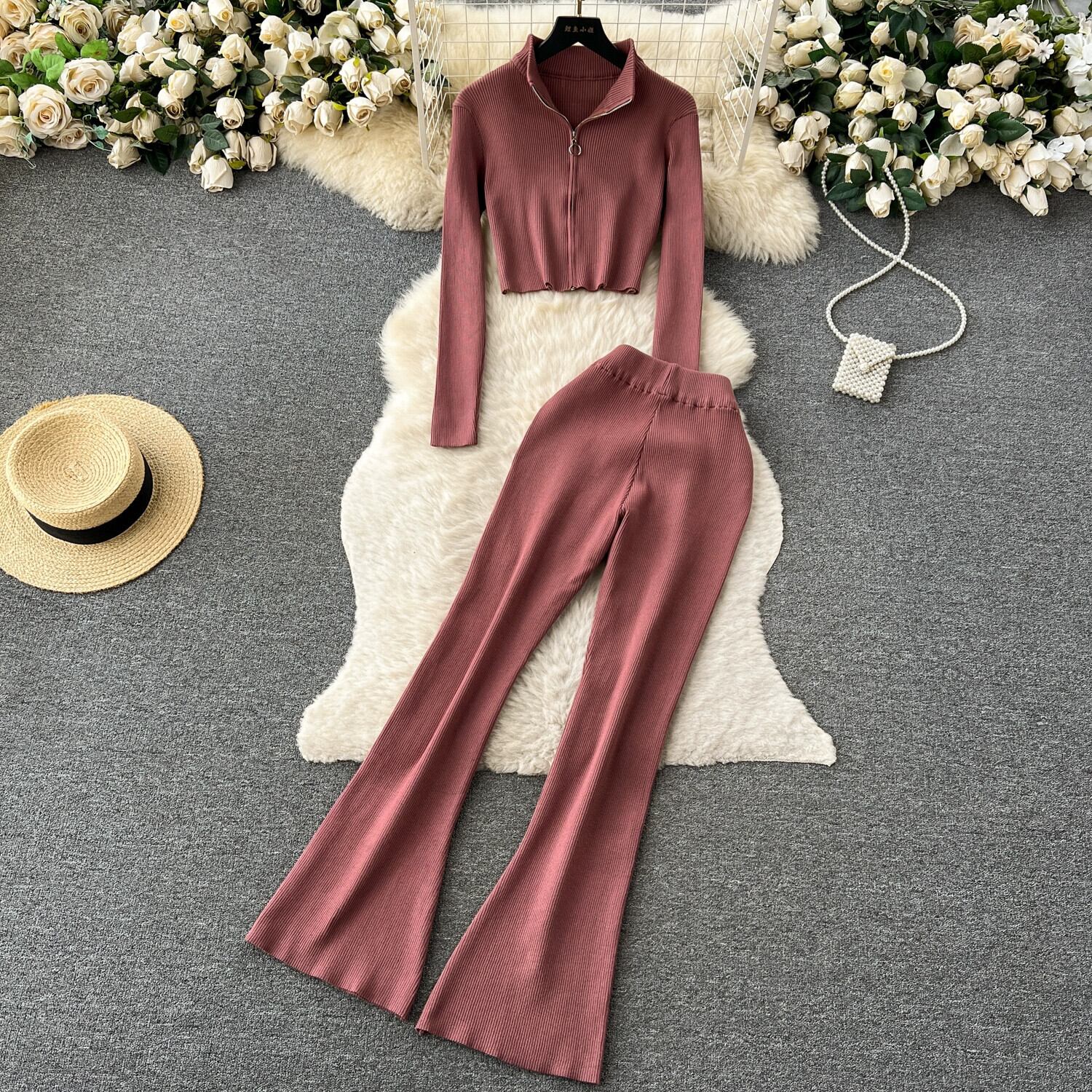 ヨーロッパとアメリカのファッショナブルなニット スーツの女性、長袖、短い、へそ出しジッパー トップ、ヒップにぴったりフィットするハイウエストのわずかにフレアな長ズボン ロング レッド ヨーロピアン lyxaj1334321836
