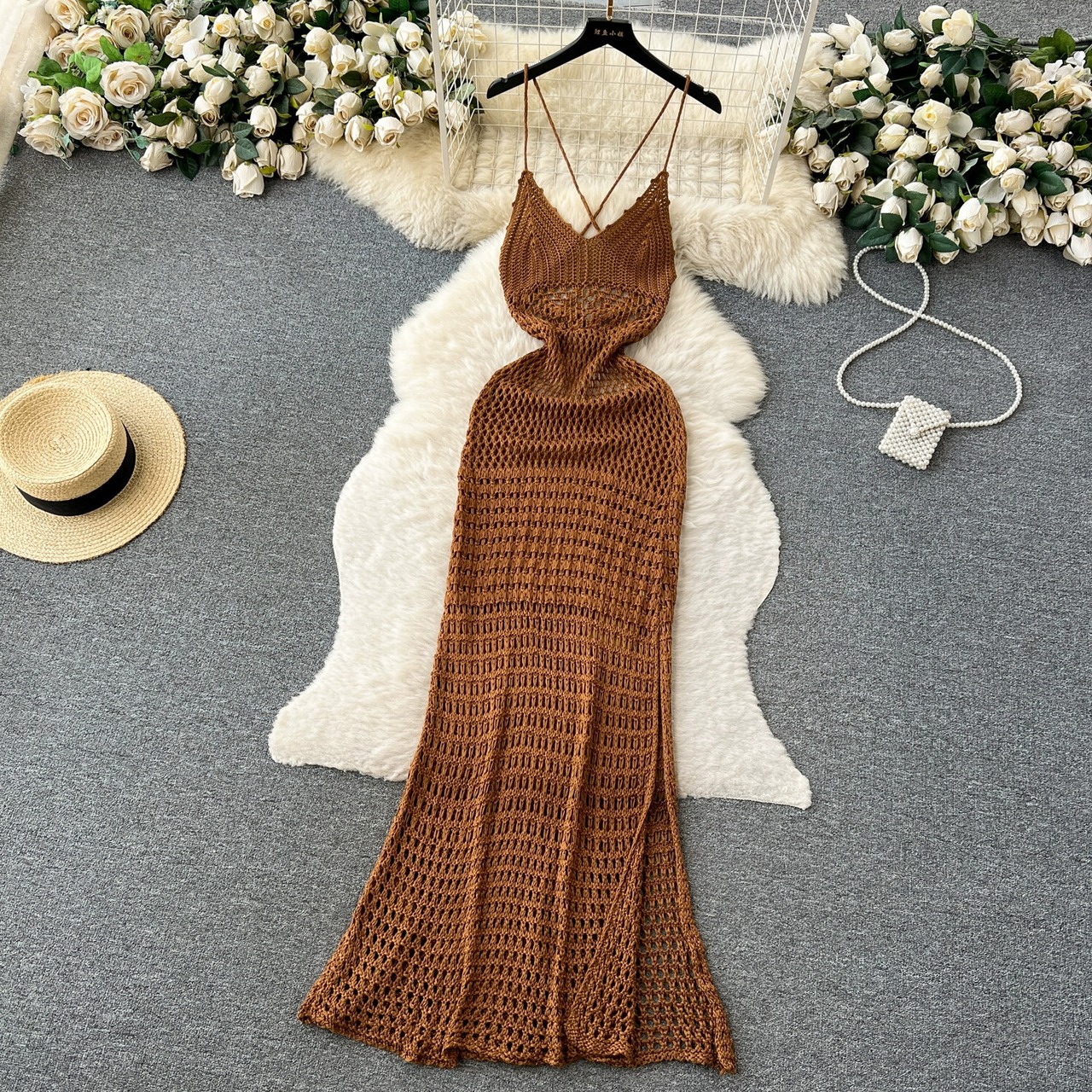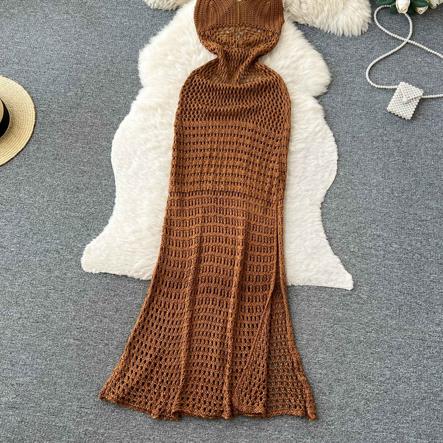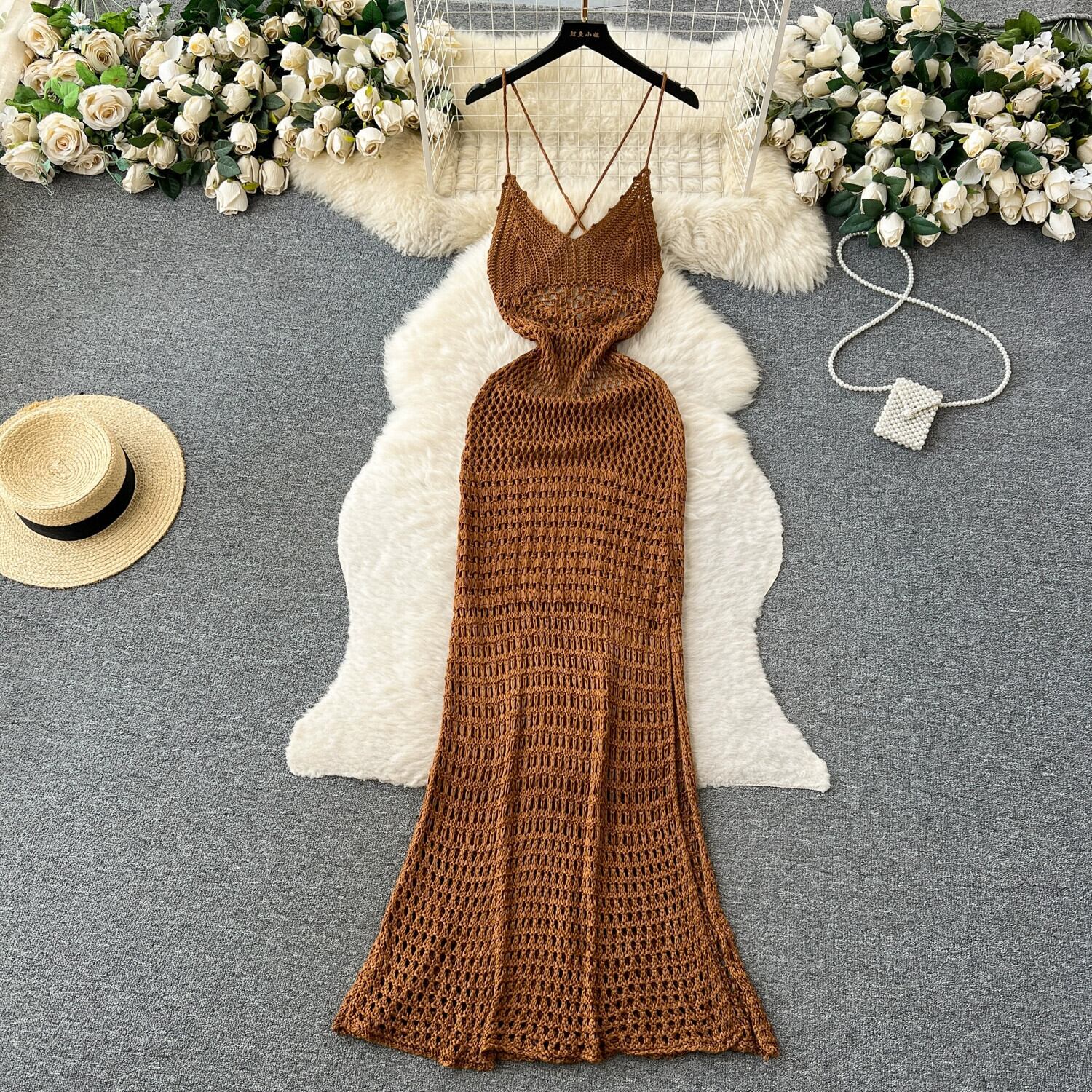 ボヘミアン海辺の休暇中空バックレスサスペンダーニットドレス女性のハイウエスト痩身旅行ビーチロングドレス ハイウェスト lyxaj59705440860