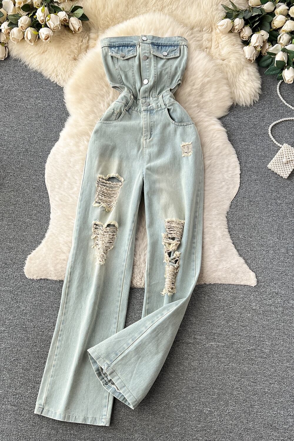 アメリカンレトロクールスタイルワンピースジーンズ夏の純粋な欲望の女性は穴を引き裂き、ウエストのデザインを露出させたニッチスリムパンツ サマー 夏物 ピュア lyxaj982072056