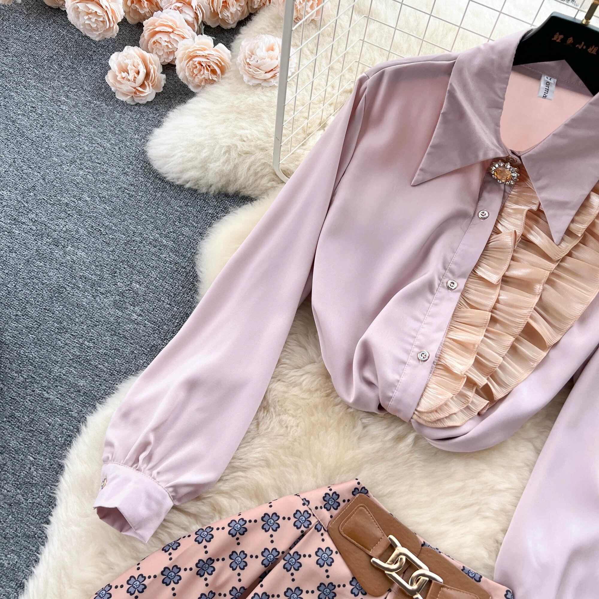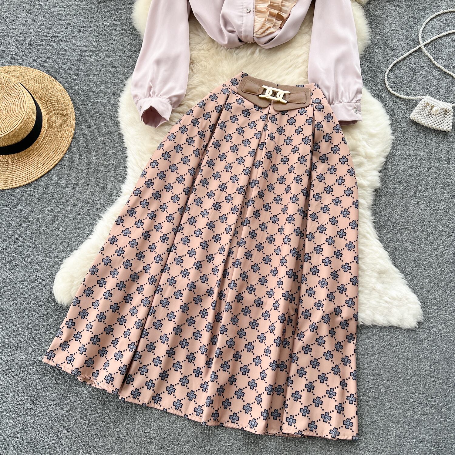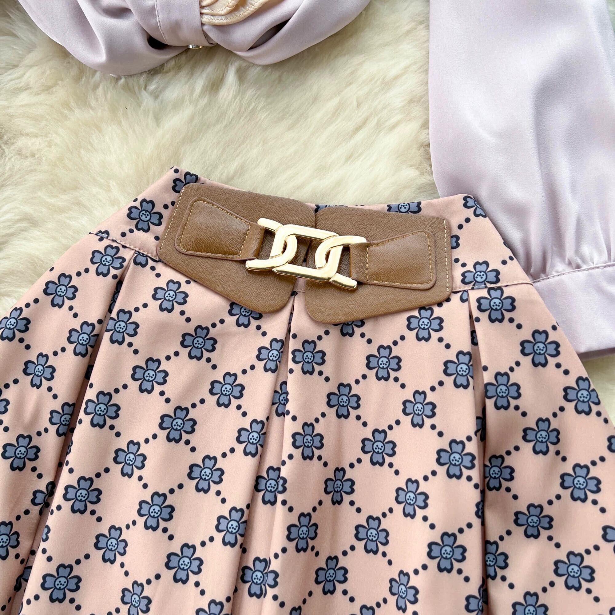 社交界のハイエンドファッションスーツの女性のフランス真菌スプライシング長袖サテンシャツハイウエストプリーツスカート ロング lyxaj17022303712