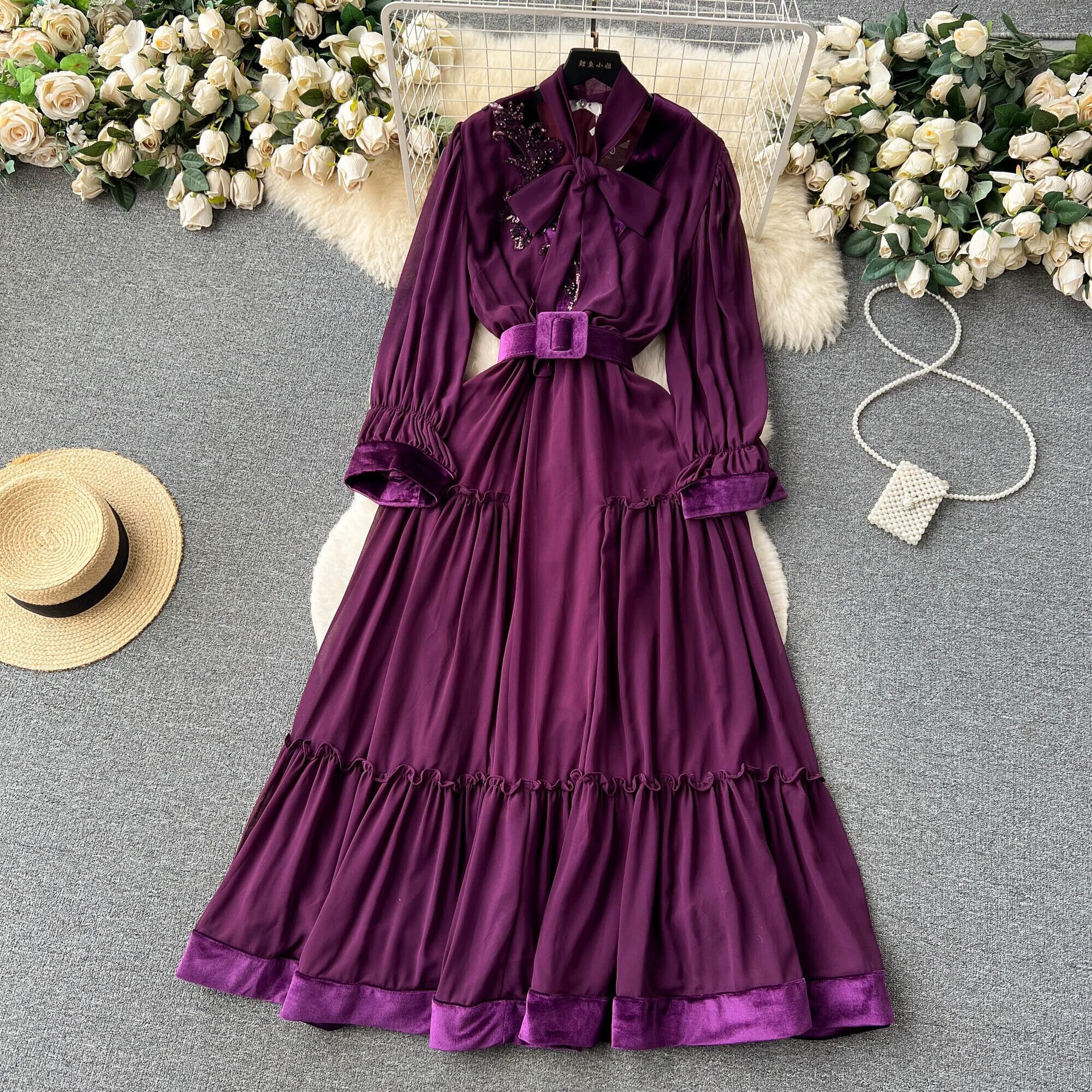 フランスの高級スパンコール蝶ネクタイ長袖ドレス女性スリムウエストとエレガントなフルスイングフリルロングスカート リボン lyxaj91025056620