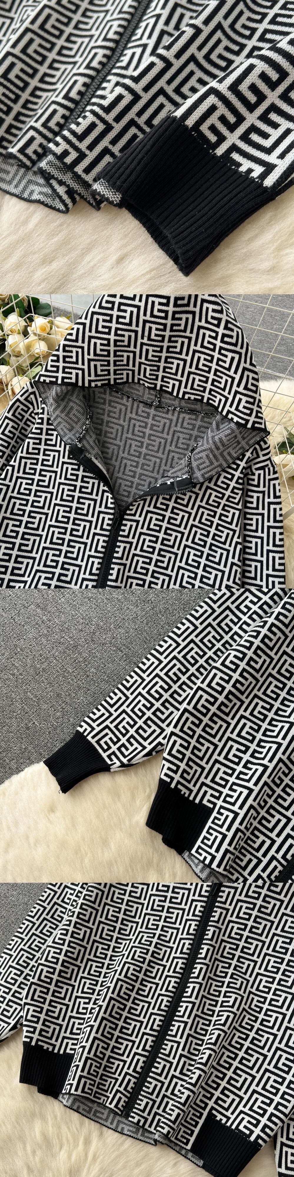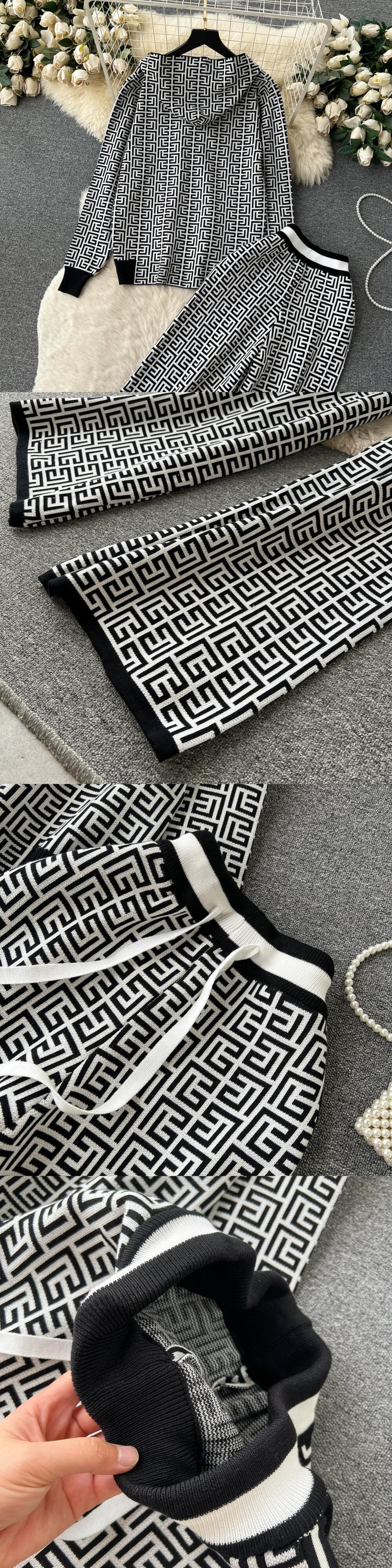 スタイルカジュアルファッションプリントスーツレディース長袖フード付きニットカーディガントップ+ワイドレッグロングパンツ2点セット lyxaj53973900105