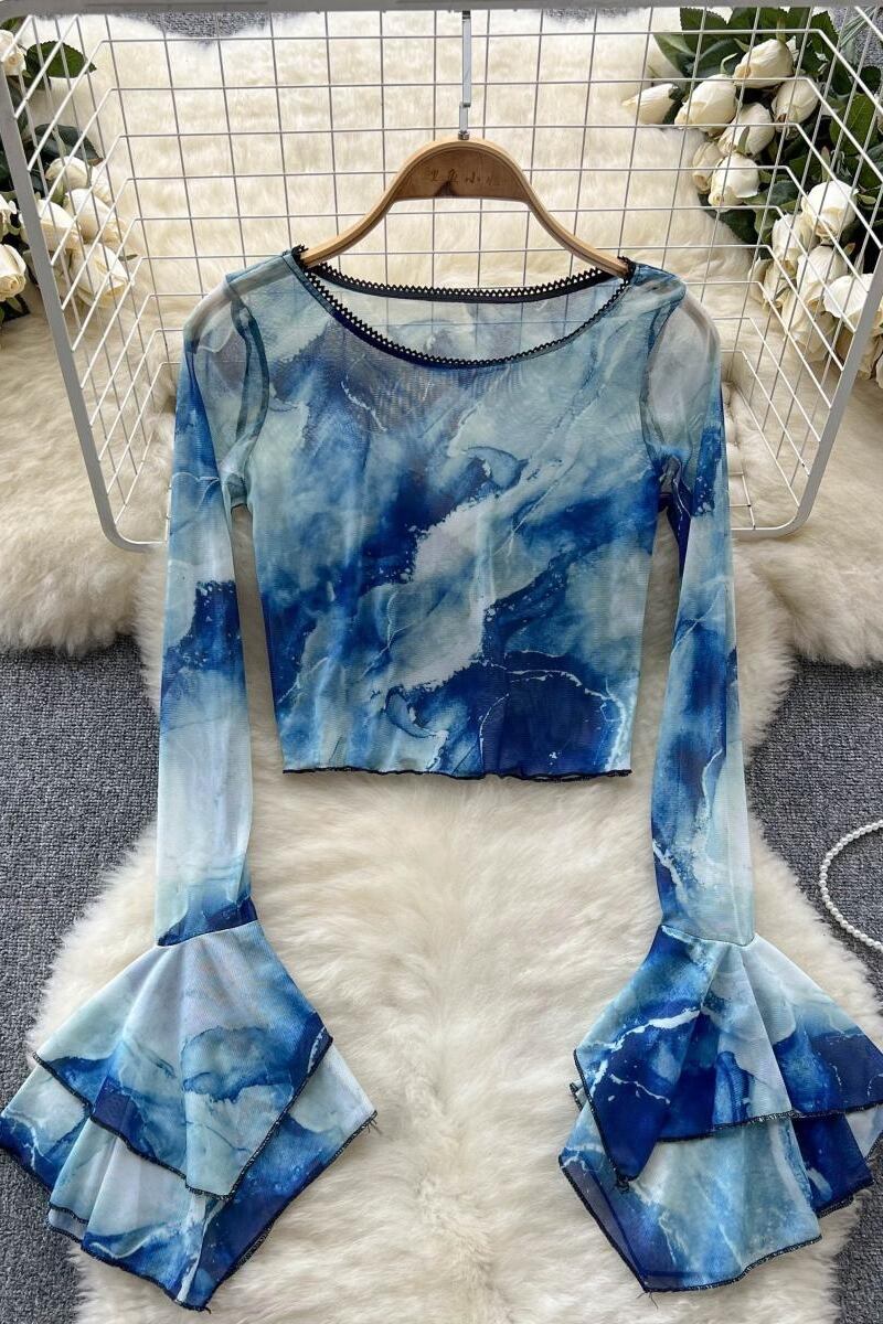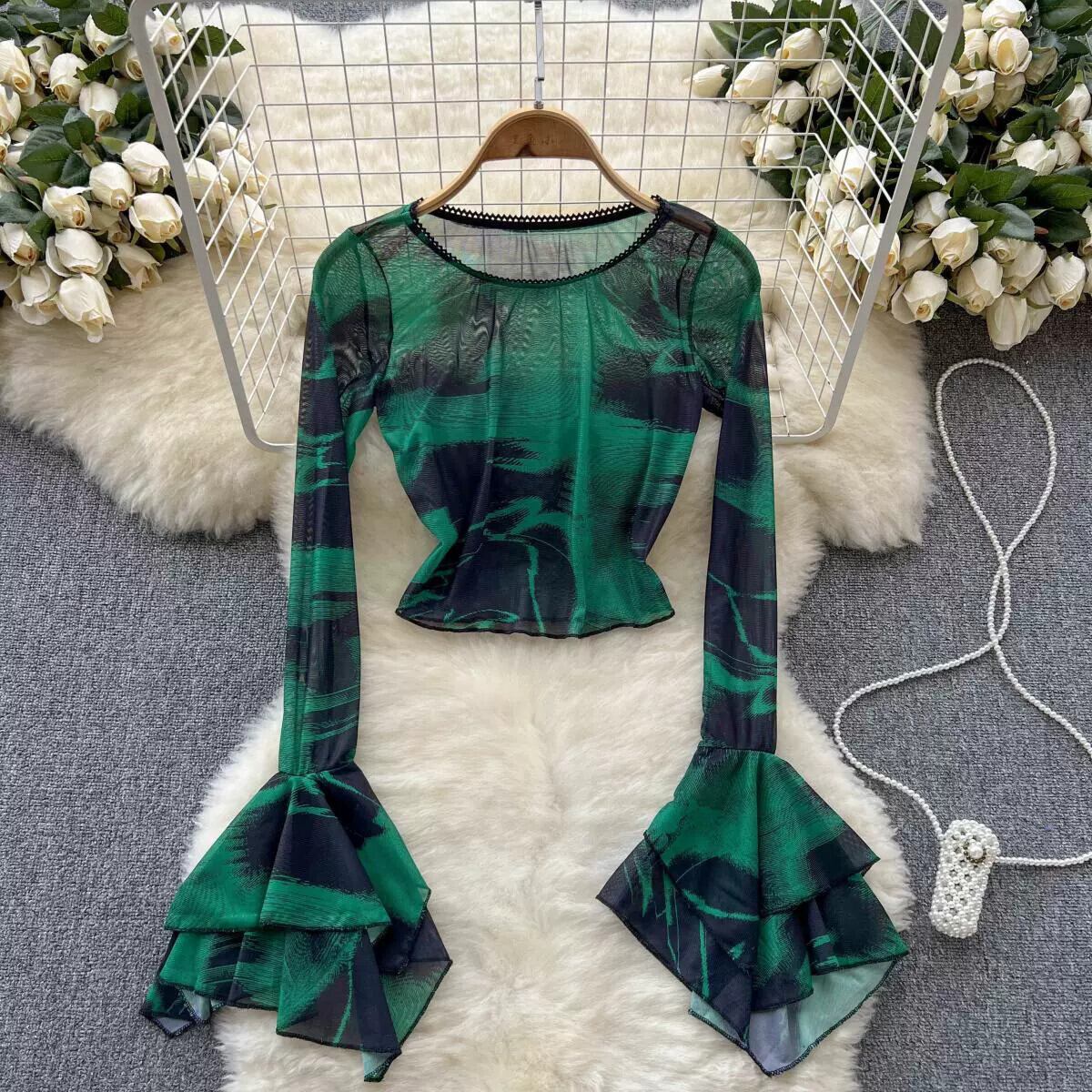 春と夏のデザインショートスタイルスリムフィット不規則なベルスリーブラウンドネックセクシーなセクシーなメッシュプリントファッショントップス スプリング 春物 サマー 夏物 Oネック lyxaj89526164665