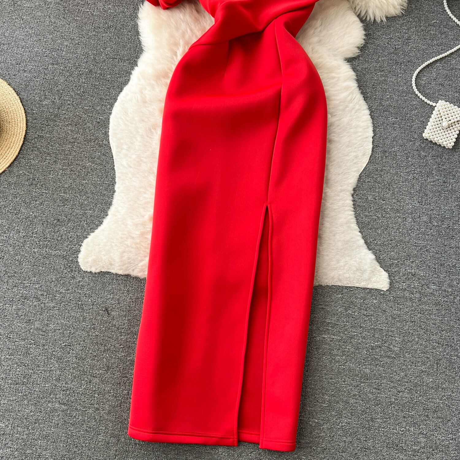 -エンドパーティードレスレディース夏フレンチスロープネックオフショルダーパフスリーブハイウエストスリットバンケットロングドレス ハイウェスト サマー 夏物 lyxaj34097651840