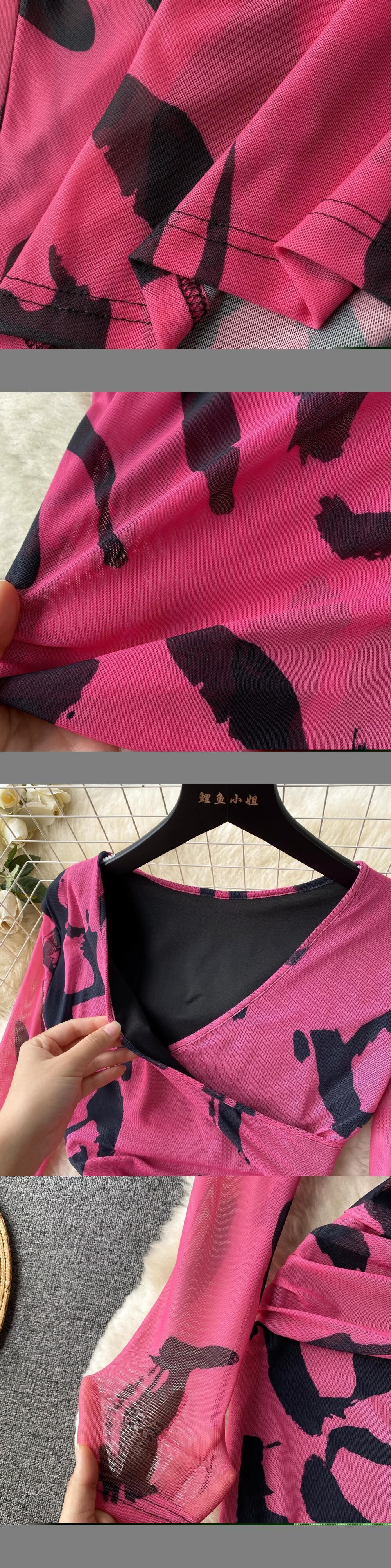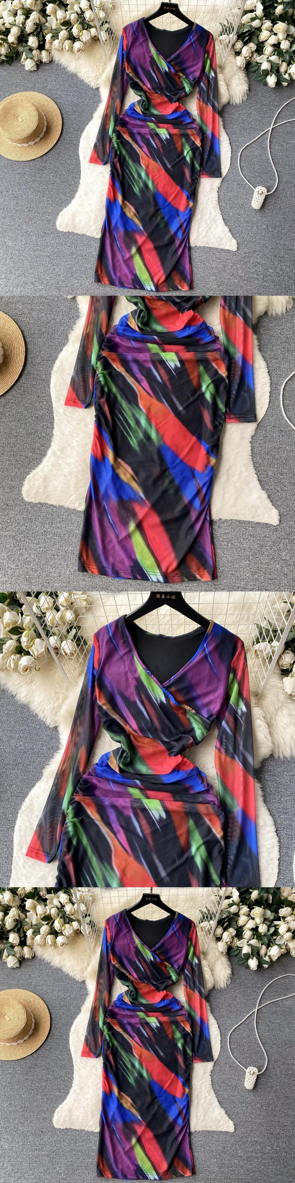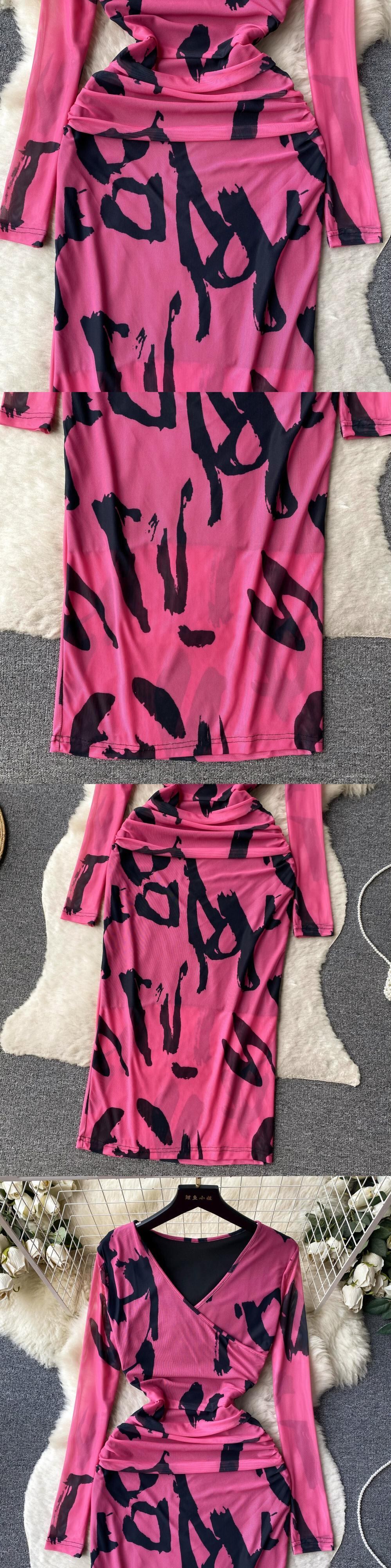 フランスのスフマートプリント V ネック長袖メッシュドレス女性、伸縮性のあるタイトフィット痩身ヒップハグスカート ロング Vネック lyxaj63552140583