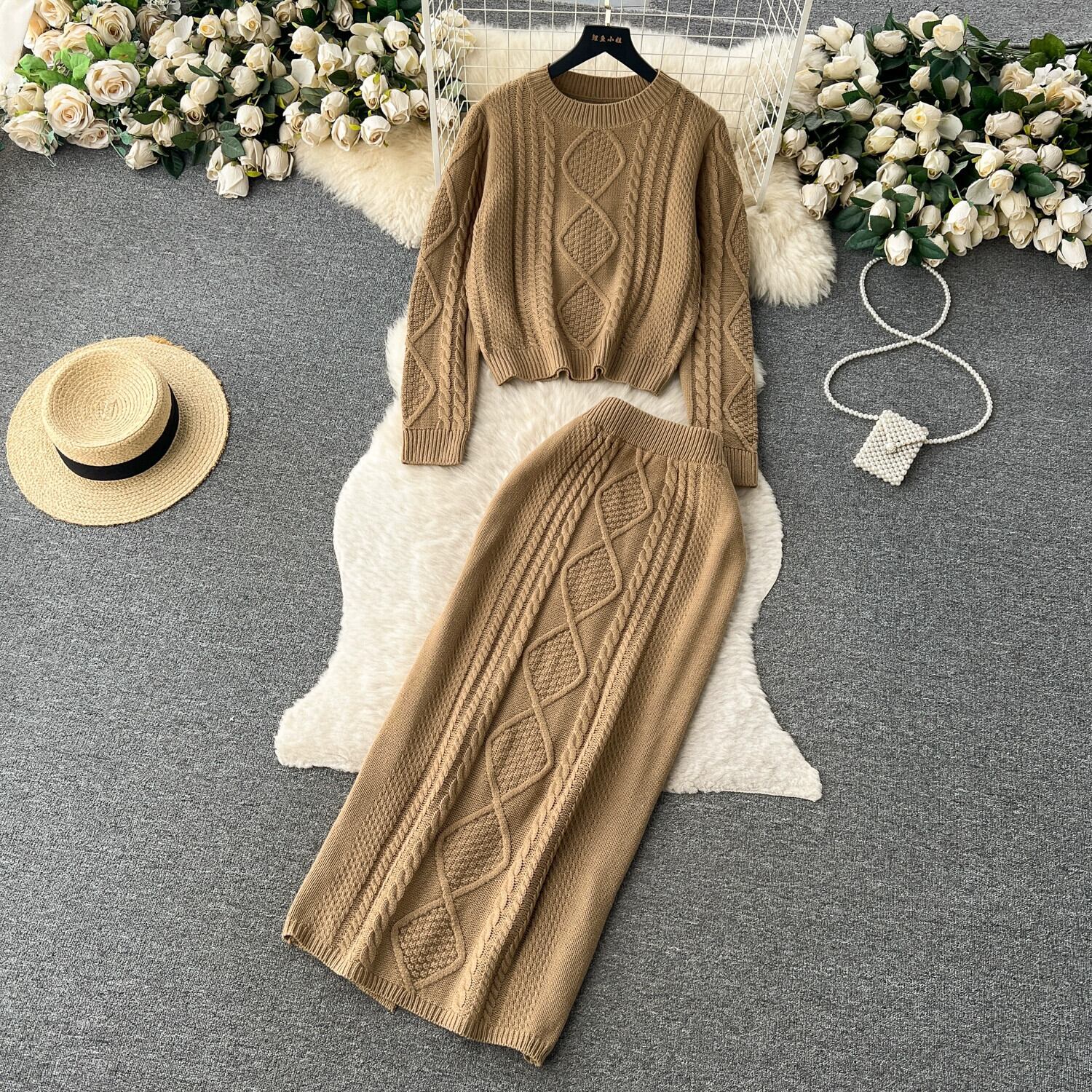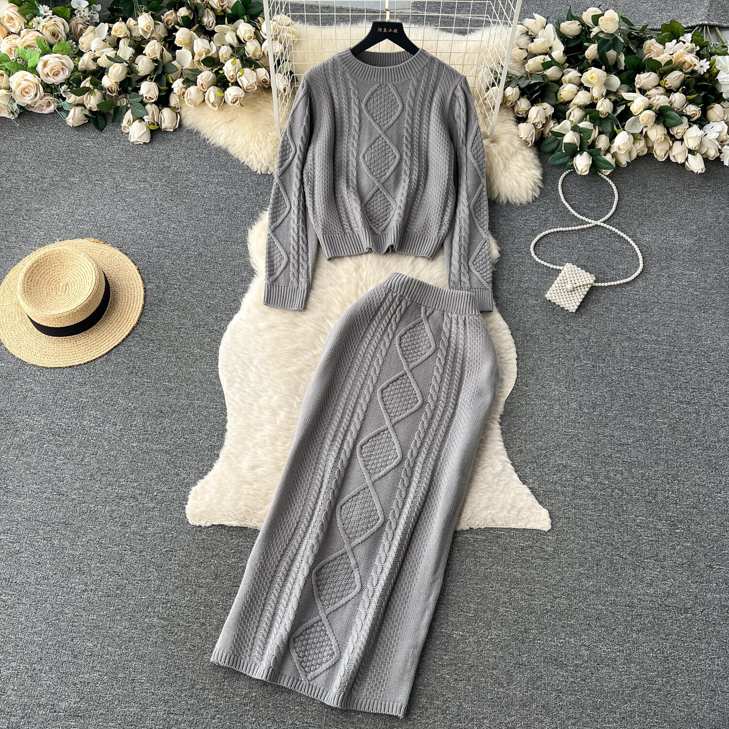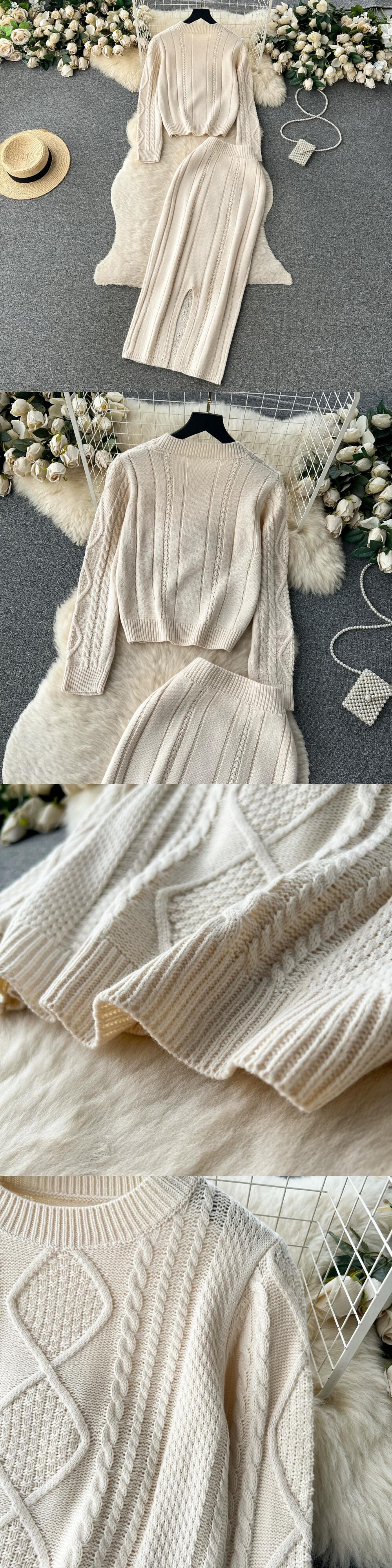 フレンチレトロニッチ長袖ラウンドネックツイストニットトップス+ハイウエスト着痩せヒップハグスリットスカートセット ロング lyxaj20107915500