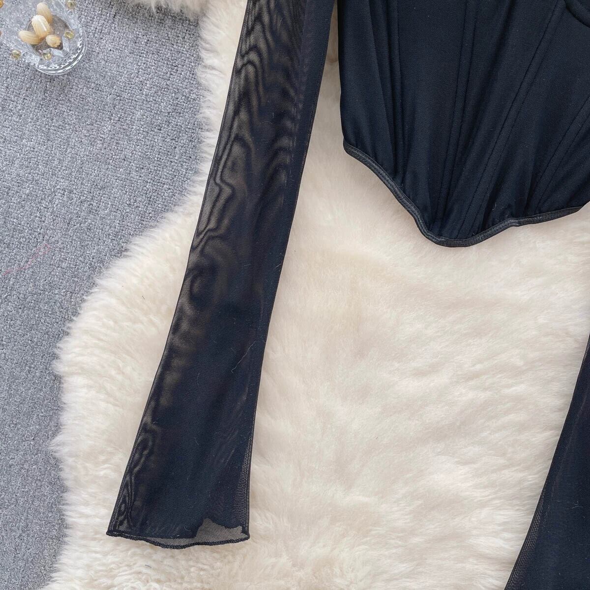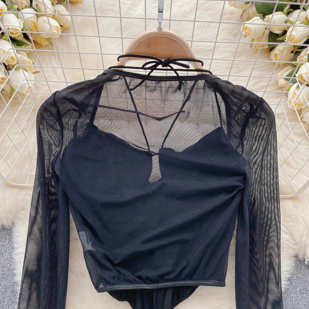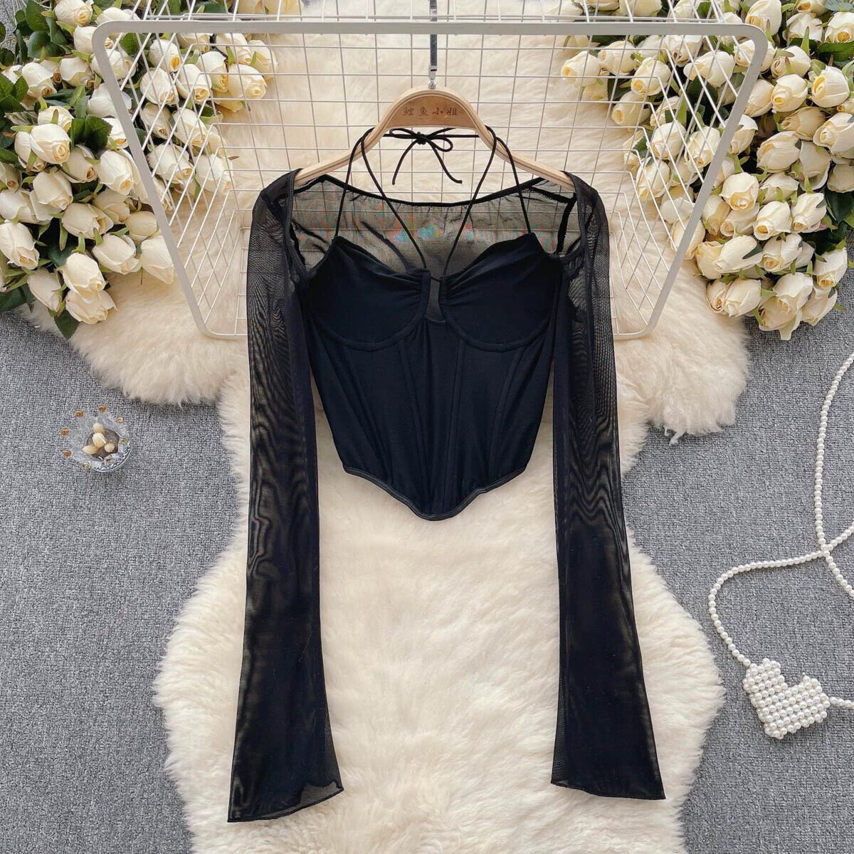 ヨーロッパとアメリカのインセクシーな純粋な欲望スタイルストラップホルターネックトップ女性の夏の長袖メッシュスプライシングフィッシュボーン tシャツトレンディな ロング サマー 夏物 ピュア ヨーロピアン lyxaj90886764381