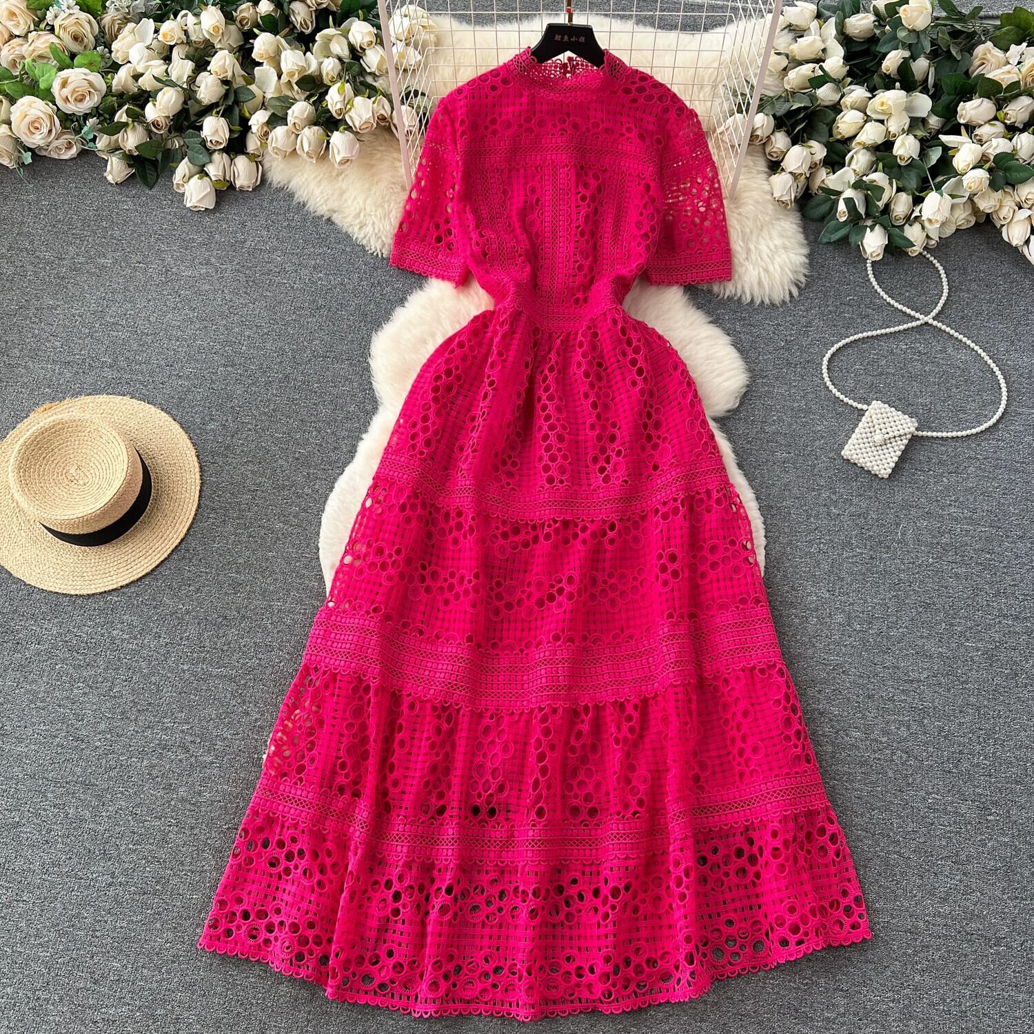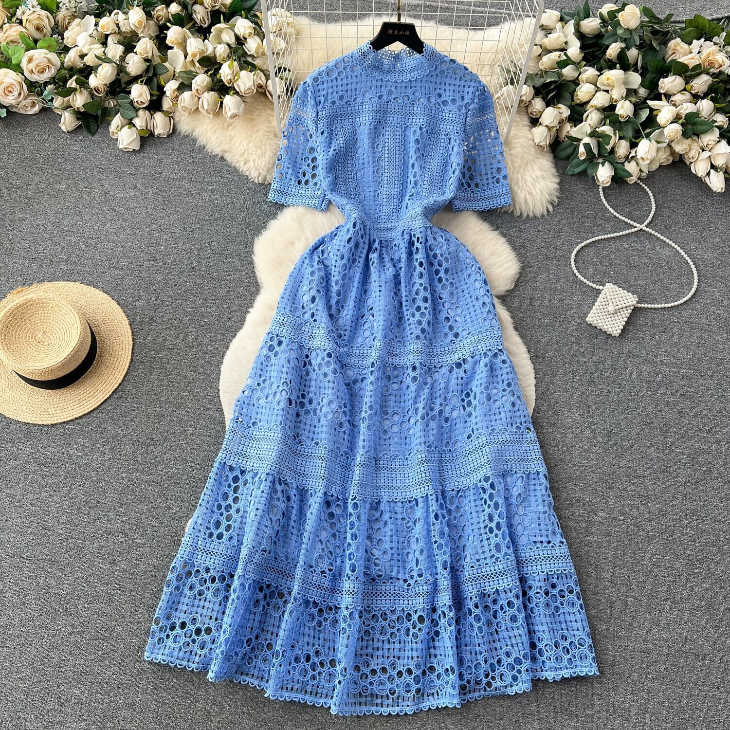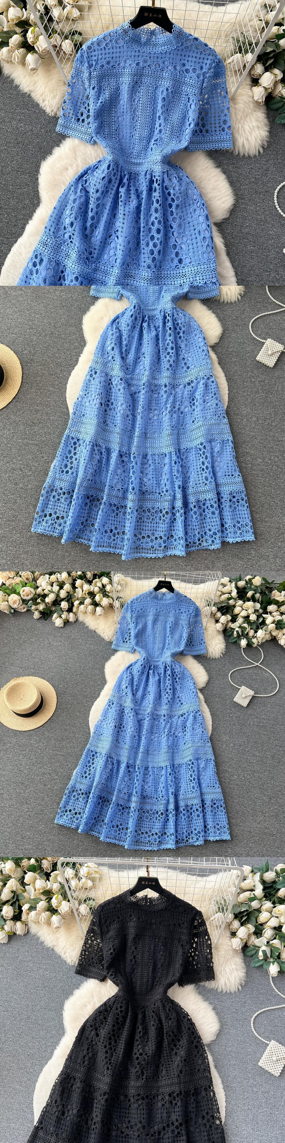 レトロヘップバーンスタイルのドレスの女性の夏中空レースデザインニッチライト高級ハイエンドエレガントな女性のドレス サマー 夏物 lyxaj17108577815