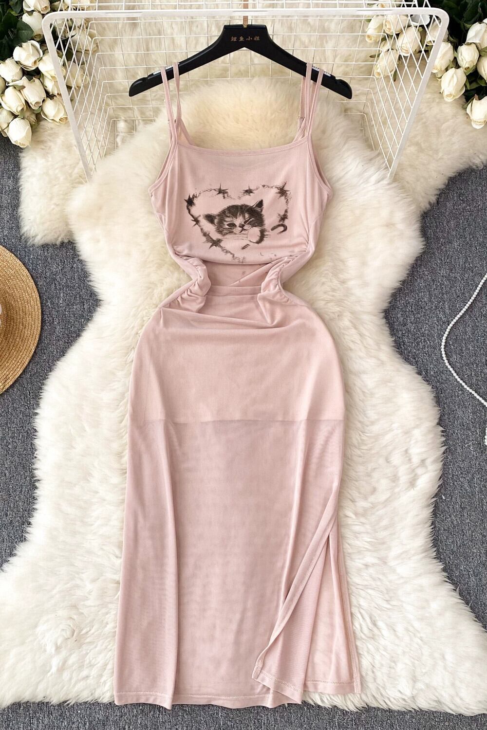 アメリカのセクシーな純粋な欲望プリントメッシュサスペンダードレス女性の夏の痩身とスリミングスリットヒップスカート サマー 夏物 ピュア lyxaj3387650385