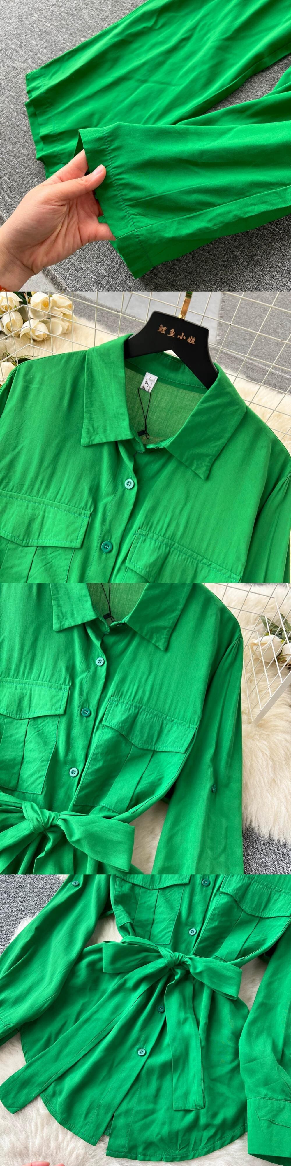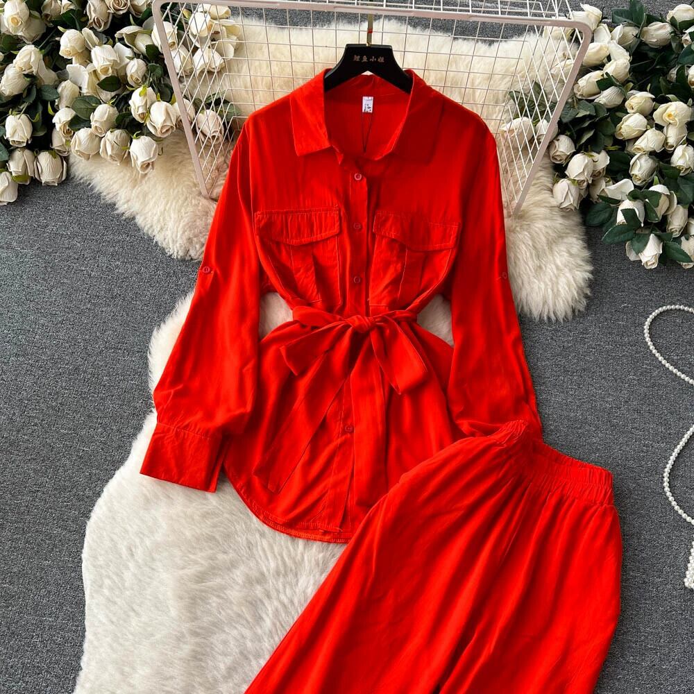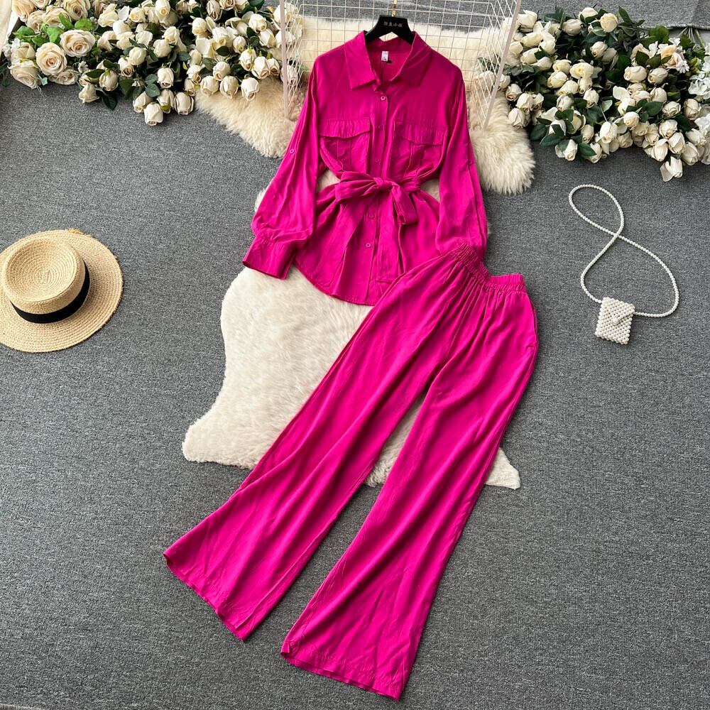 夏の女性向けスーツ、年齢を軽減するデザイン、ウエストを締めるランタンスリーブシャツ、無地の痩身ワイドレッグパンツ、トレンディなツーピースセット サマー 夏物 ソリッドカラー lyxaj69163532486