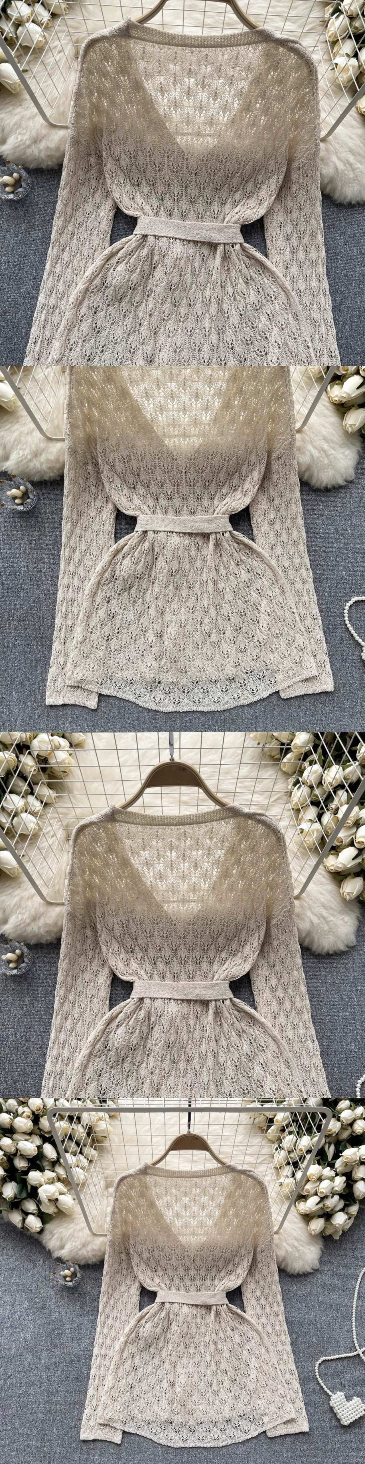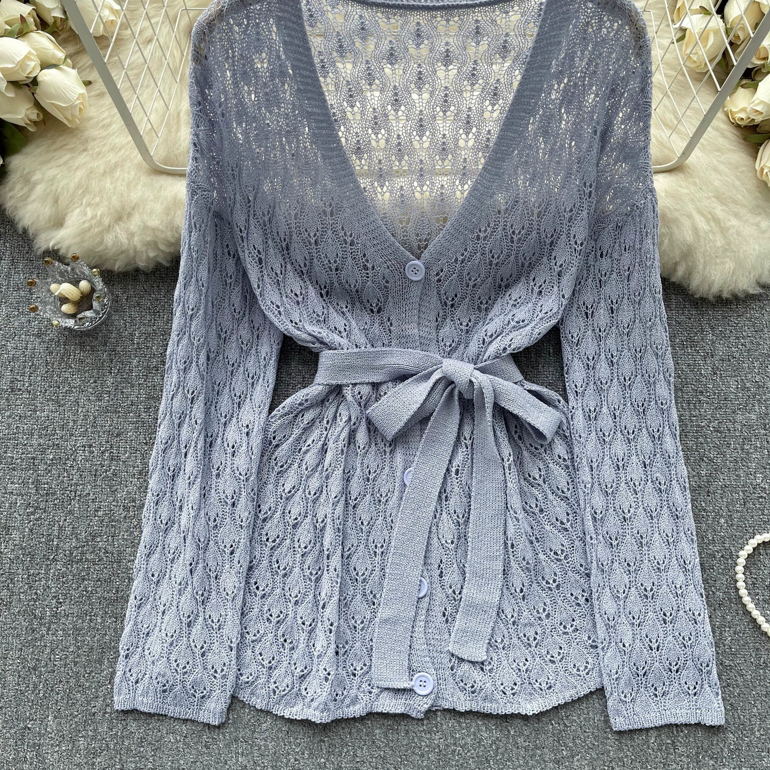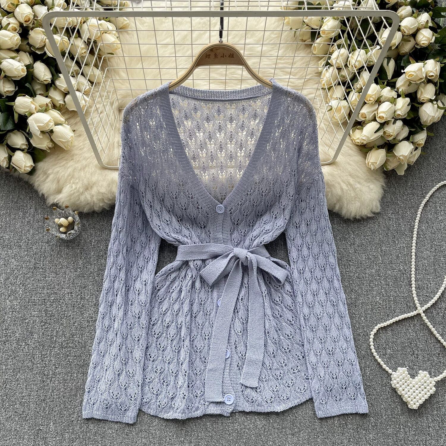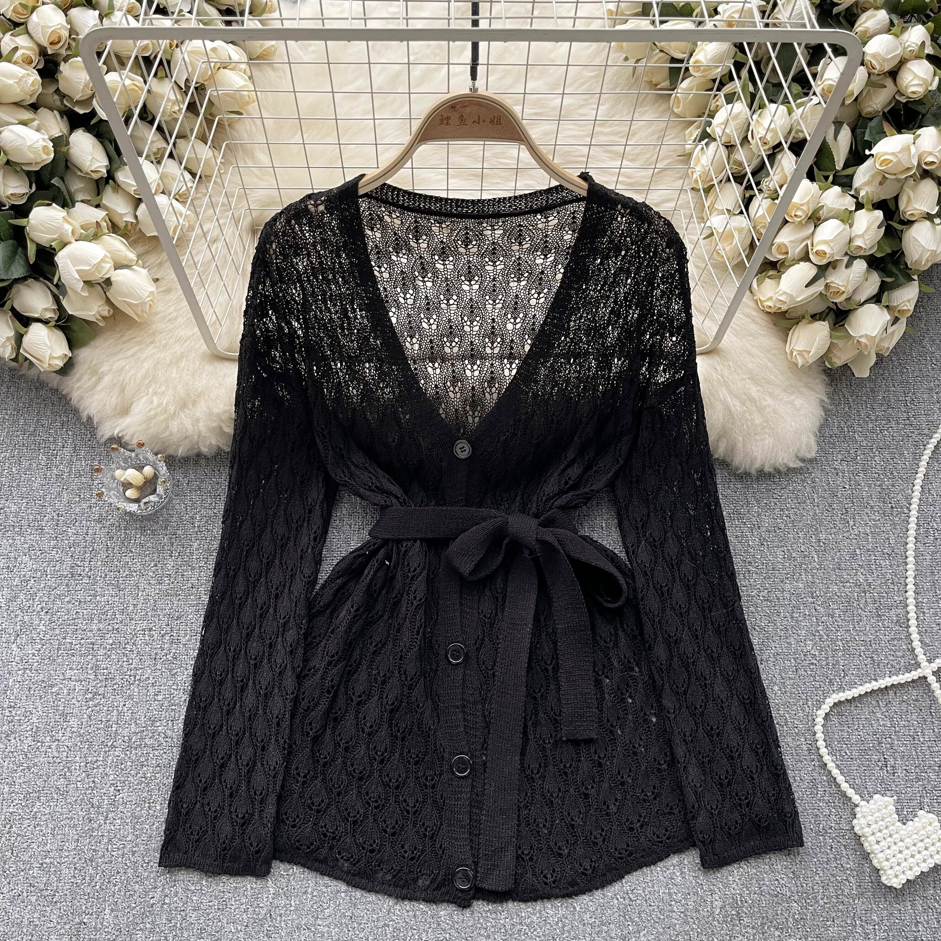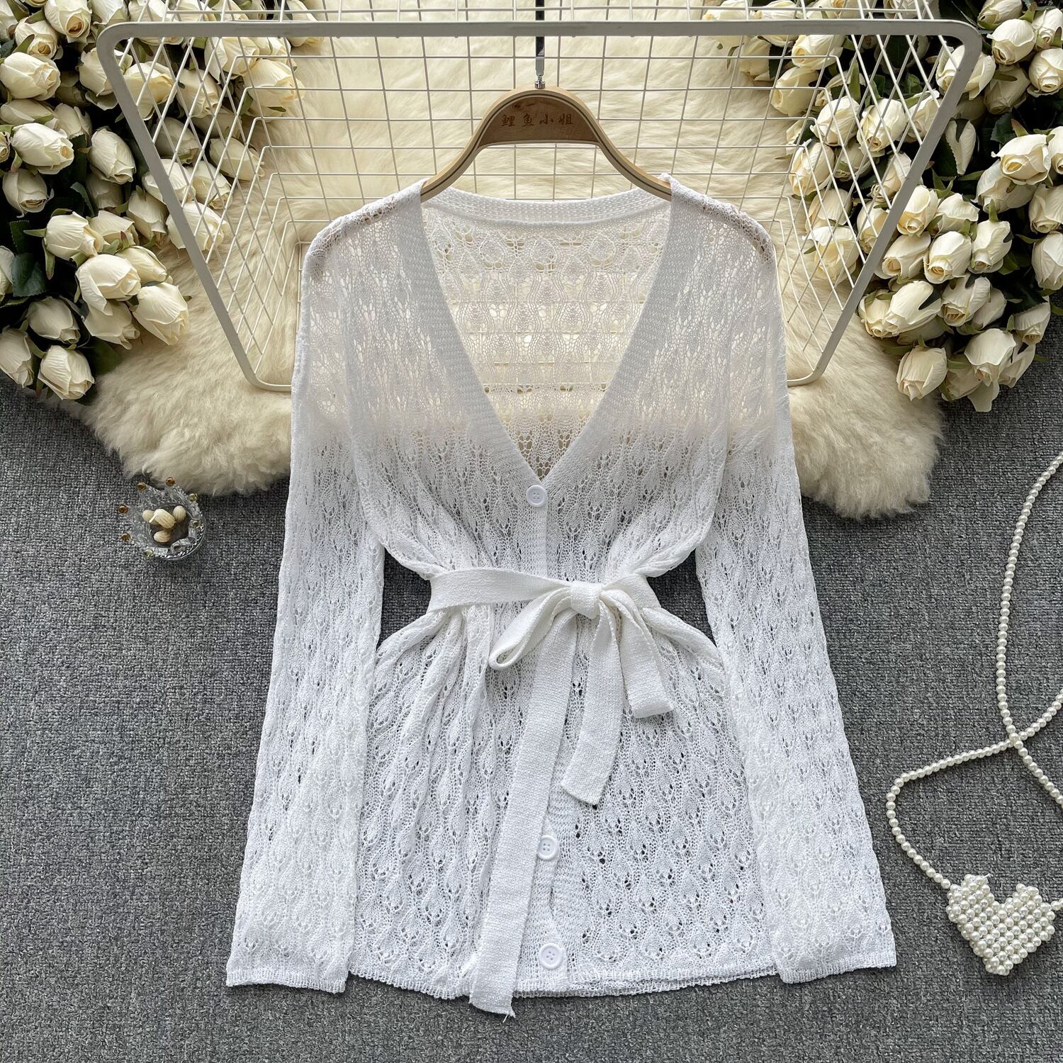 シックなニッチデザインの中空ニットカーディガン女性の新しいシンプルで多用途なウエストを締める長袖日焼け防止トップ ロング lyxaj33909497833