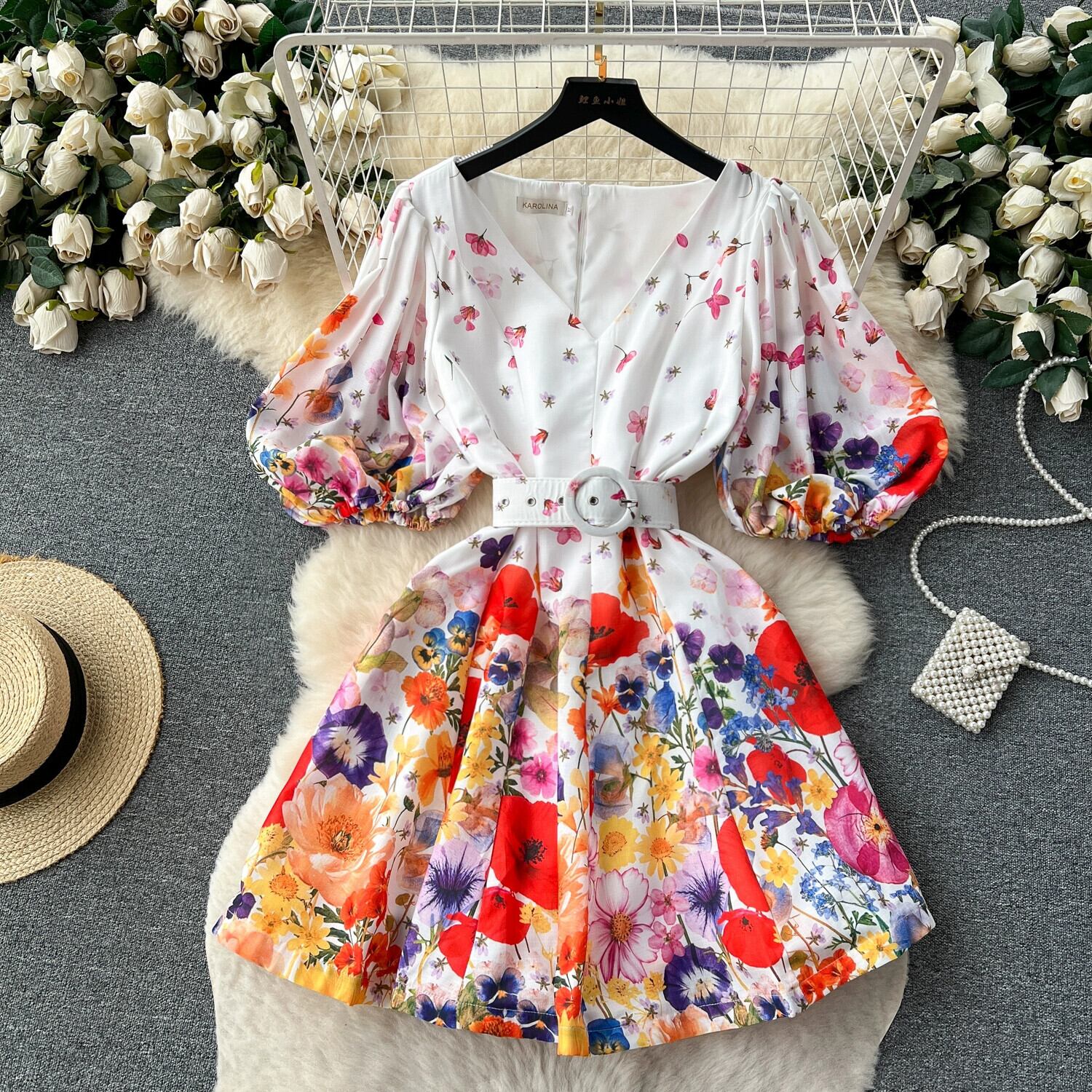 ヨーロッパのレトロな宮殿スタイルの V ネックパフスリーブプリントスカート女性の夏のフレンチウエスト痩身 A ラインドレス レース サマー 夏物 Vネック Aライン ヨーロピアン lyxaj23682238343