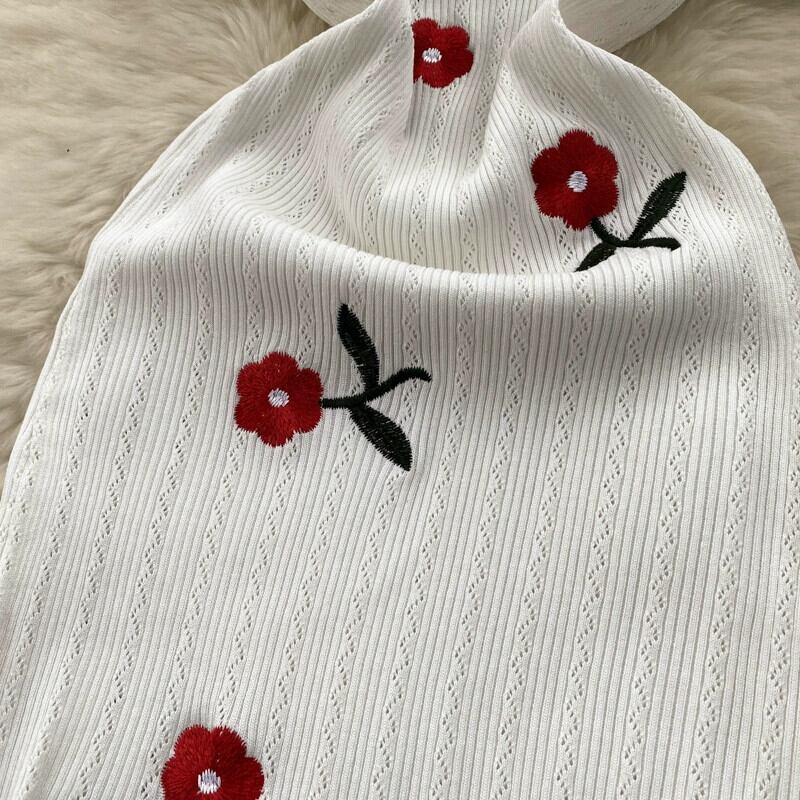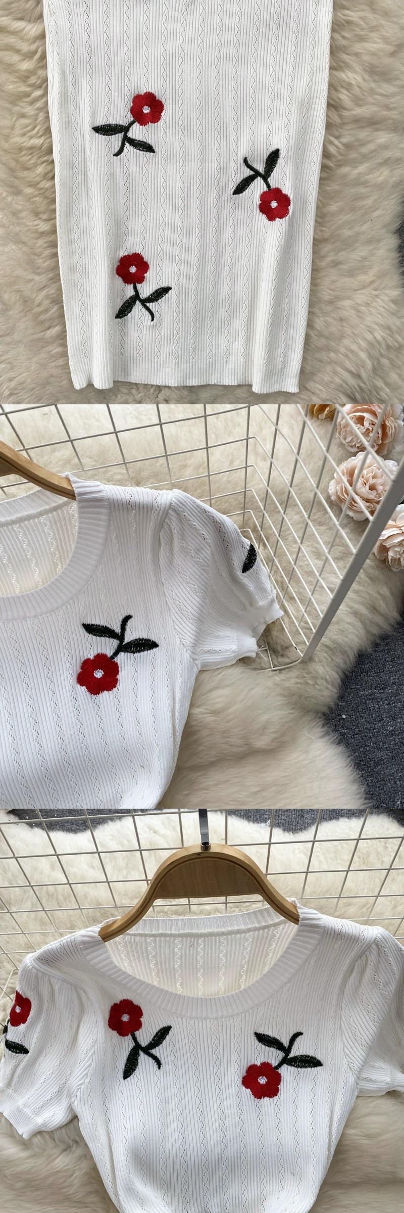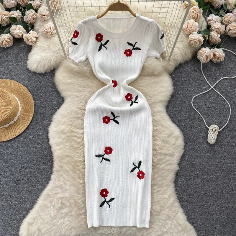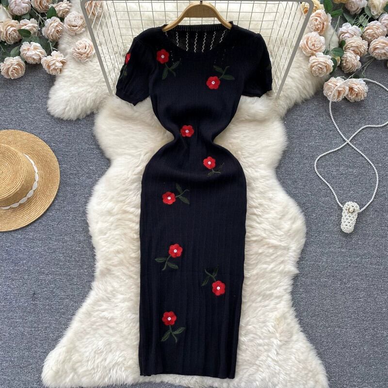 フレンチレトロなニッチローズ刺繍ニットパフスリーブドレス、スリムウエストとスリムフィットロングスカート レッド lyxaj9107624958