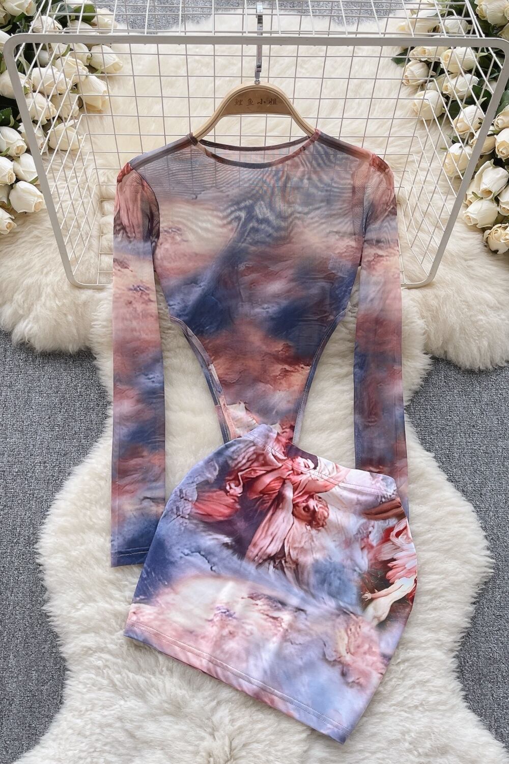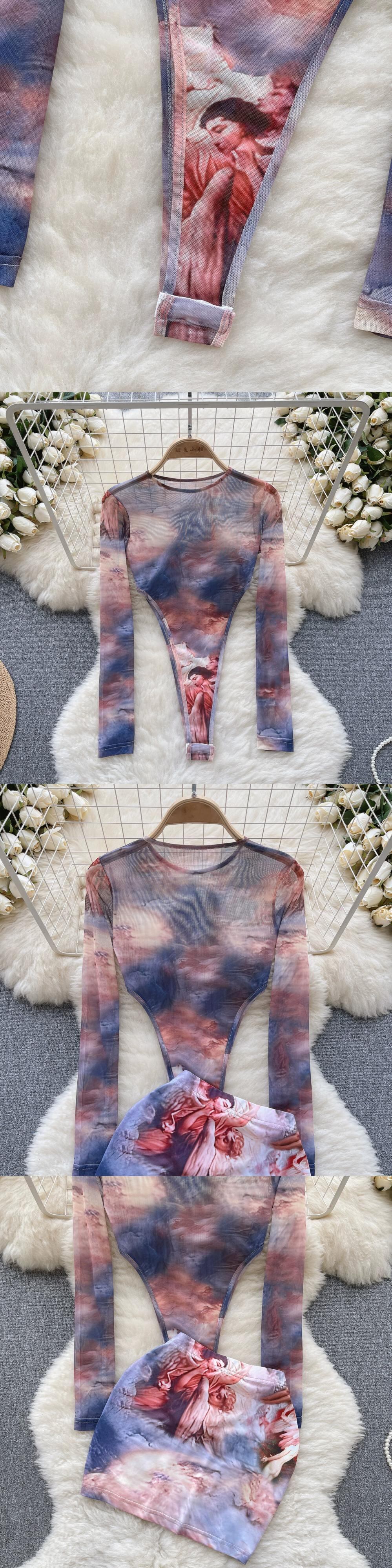 ヨーロッパとアメリカの純粋な欲望スタイルのタイトなチュール長袖ジャンプスーツ + ハイウエストヒップタイショートスカートツーピーススーツ女性夏の ハイウェスト ロング サマー 夏物 ピュア ヨーロピアン lyxaj84969402660