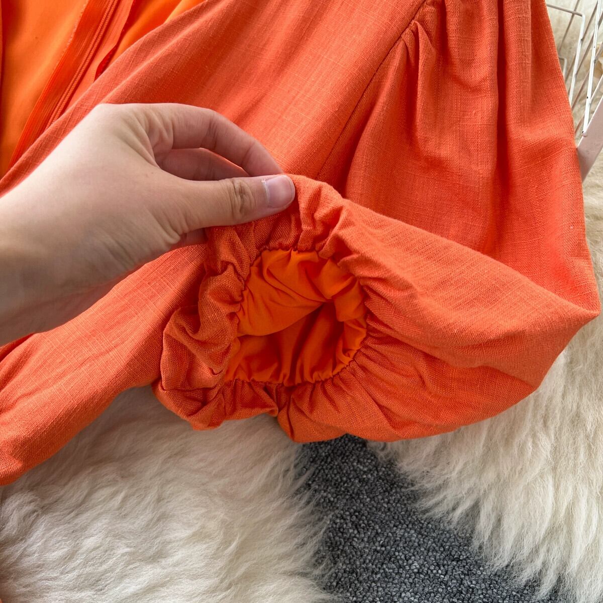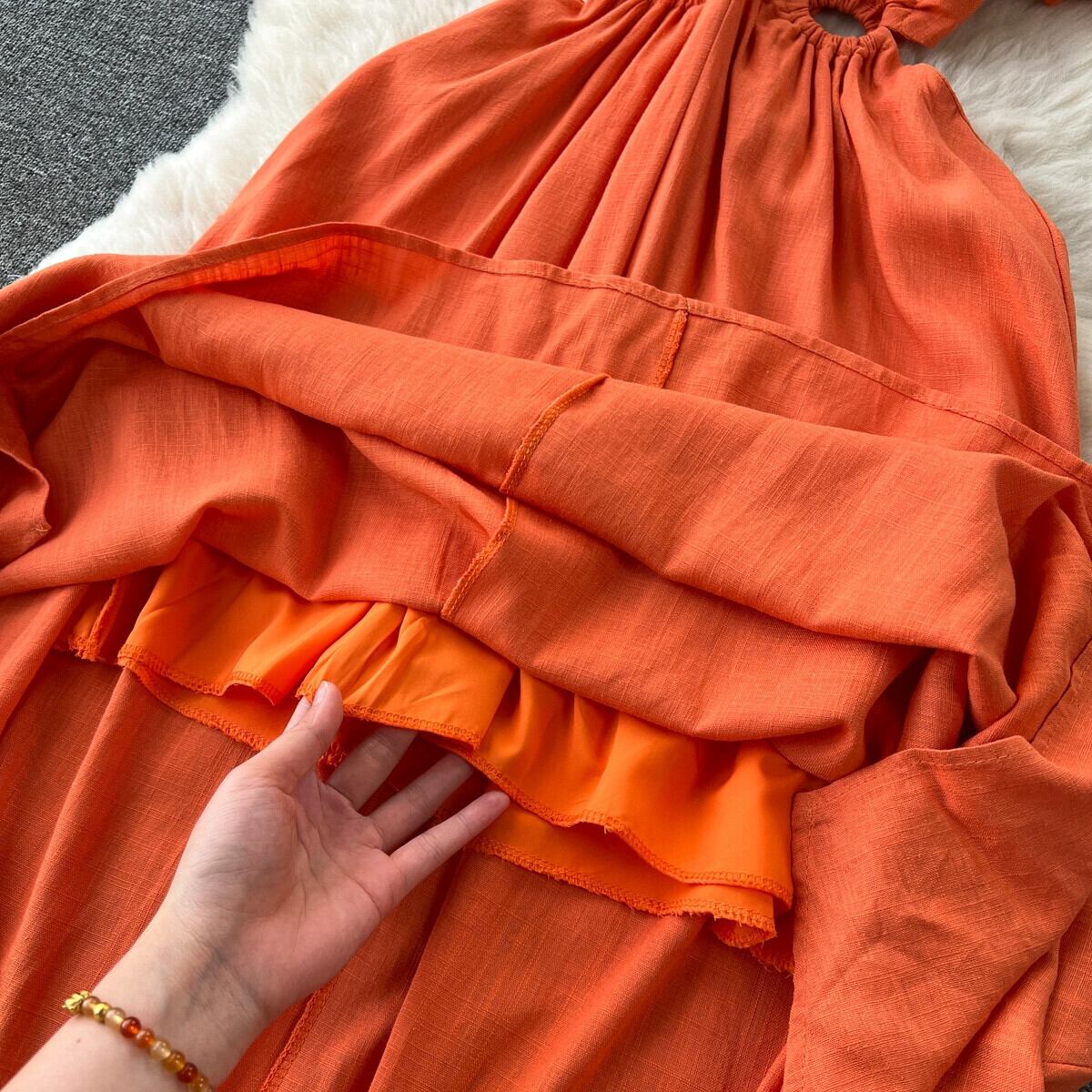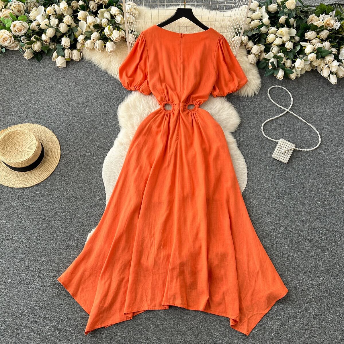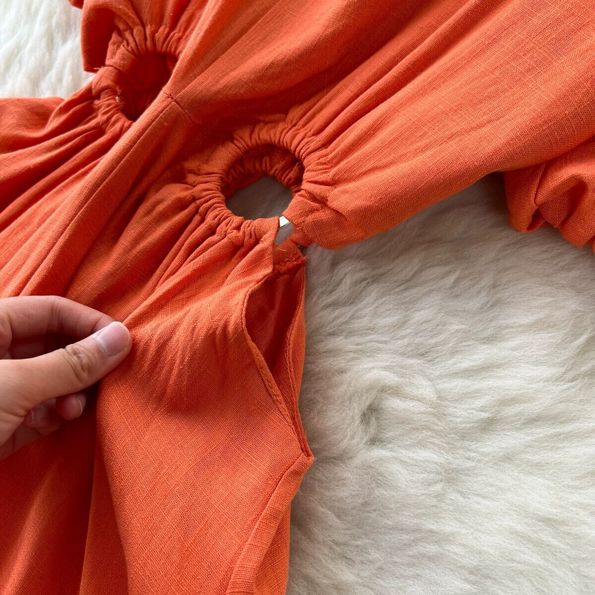 フレンチ V ネックパフスリーブドレス女性夏中空ウエスト明らかに - 痩身気質海辺の休暇ロングドレス サマー 夏物 Vネック lyxaj81172925755