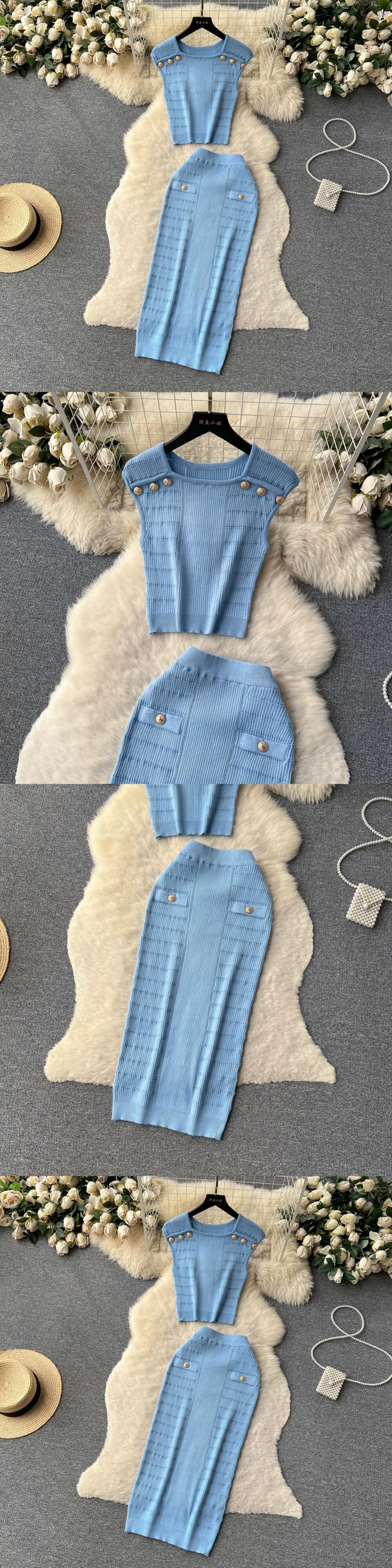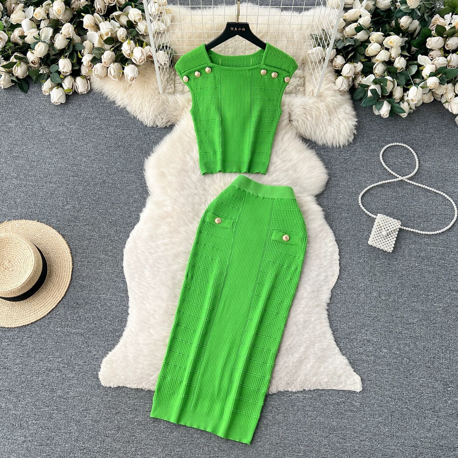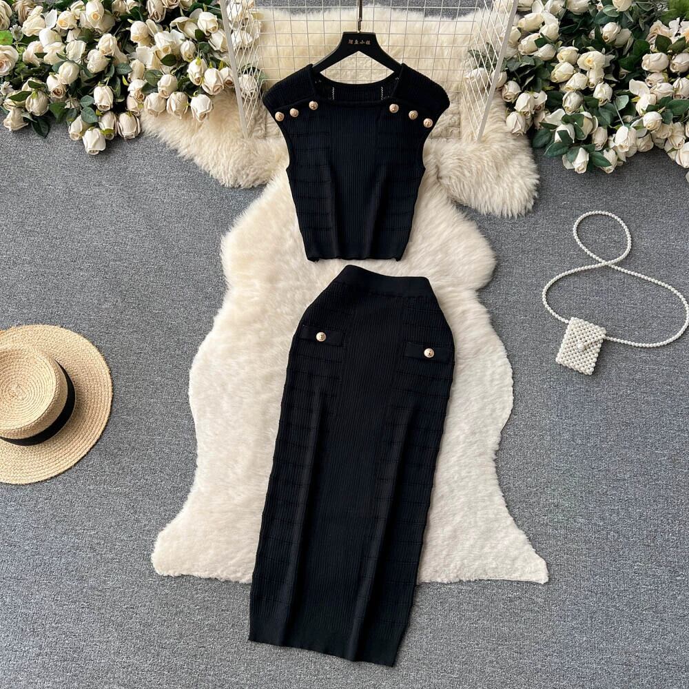 ニットスーツの女性の夏服 2023 ノースリーブトップ万能ウエストスカート 2 点セットレディスタイル サマー 夏物 lyxaj42233184742