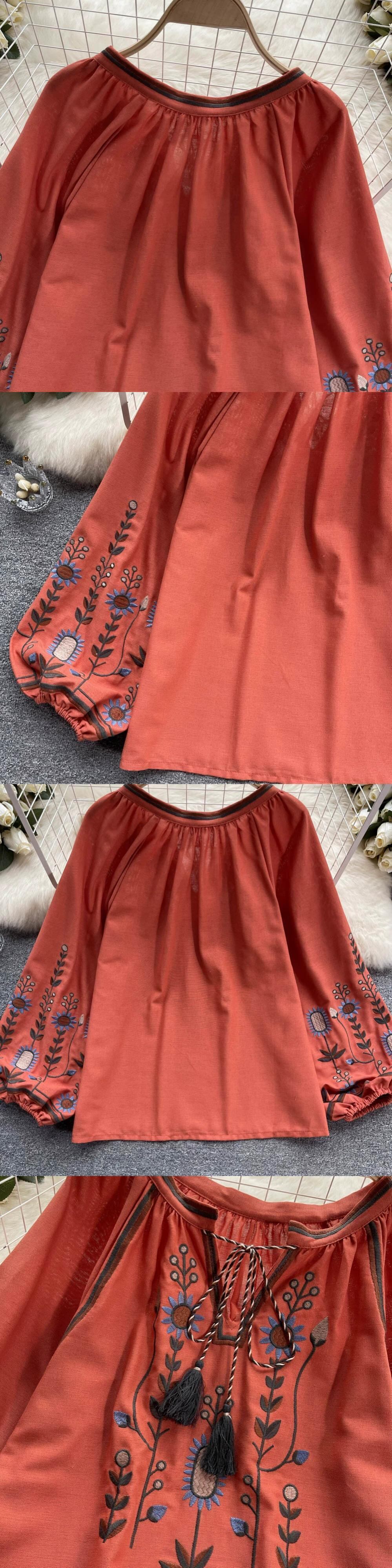 ボヘミアンスタイルのレトロな刺繍プリント長袖シャツトップス女性ルーズカジュアルフレンチシックなベビードールシャツ ロング レッド lyxaj15379612925
