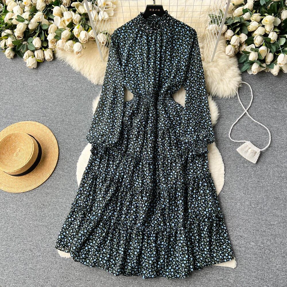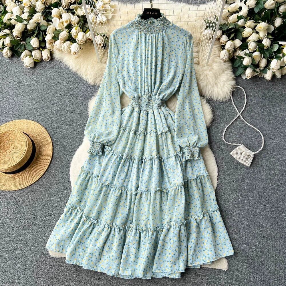 フランス長袖花柄シフォンドレス女性春と秋の新しい弾性ウエスト甘い妖精菌ロングスカート エラスティック 伸縮 大人ガーリー スウィート キュート カジュアル スプリング 春物 オータム 秋物 lyxaj73071887737