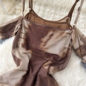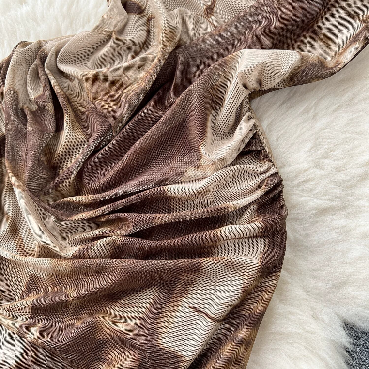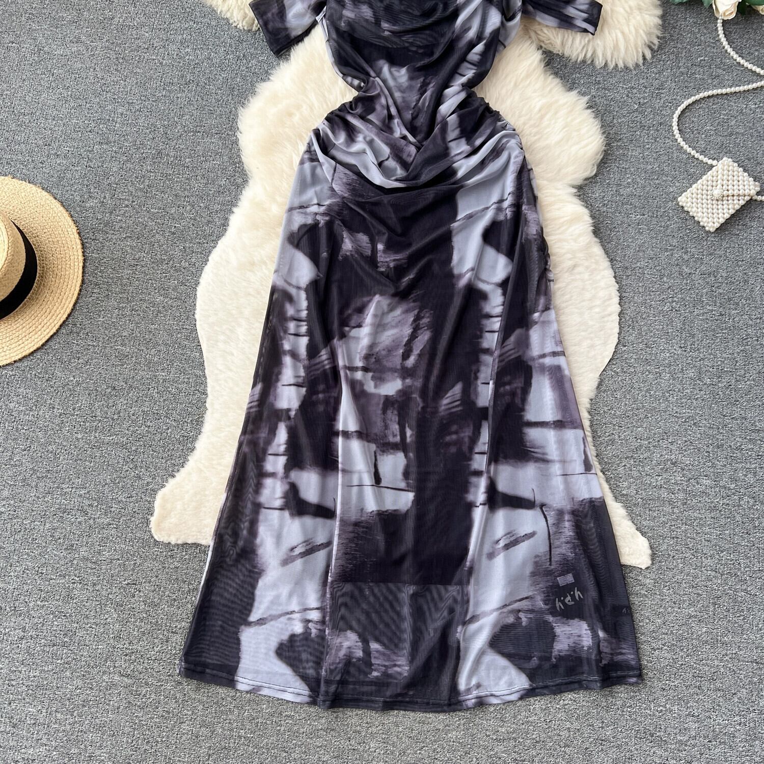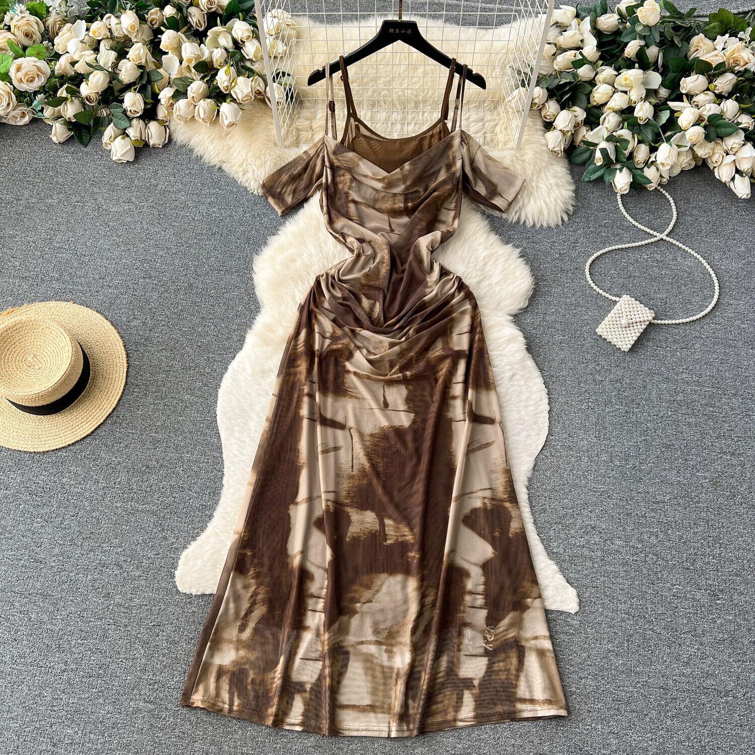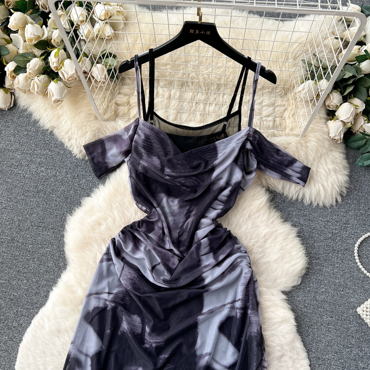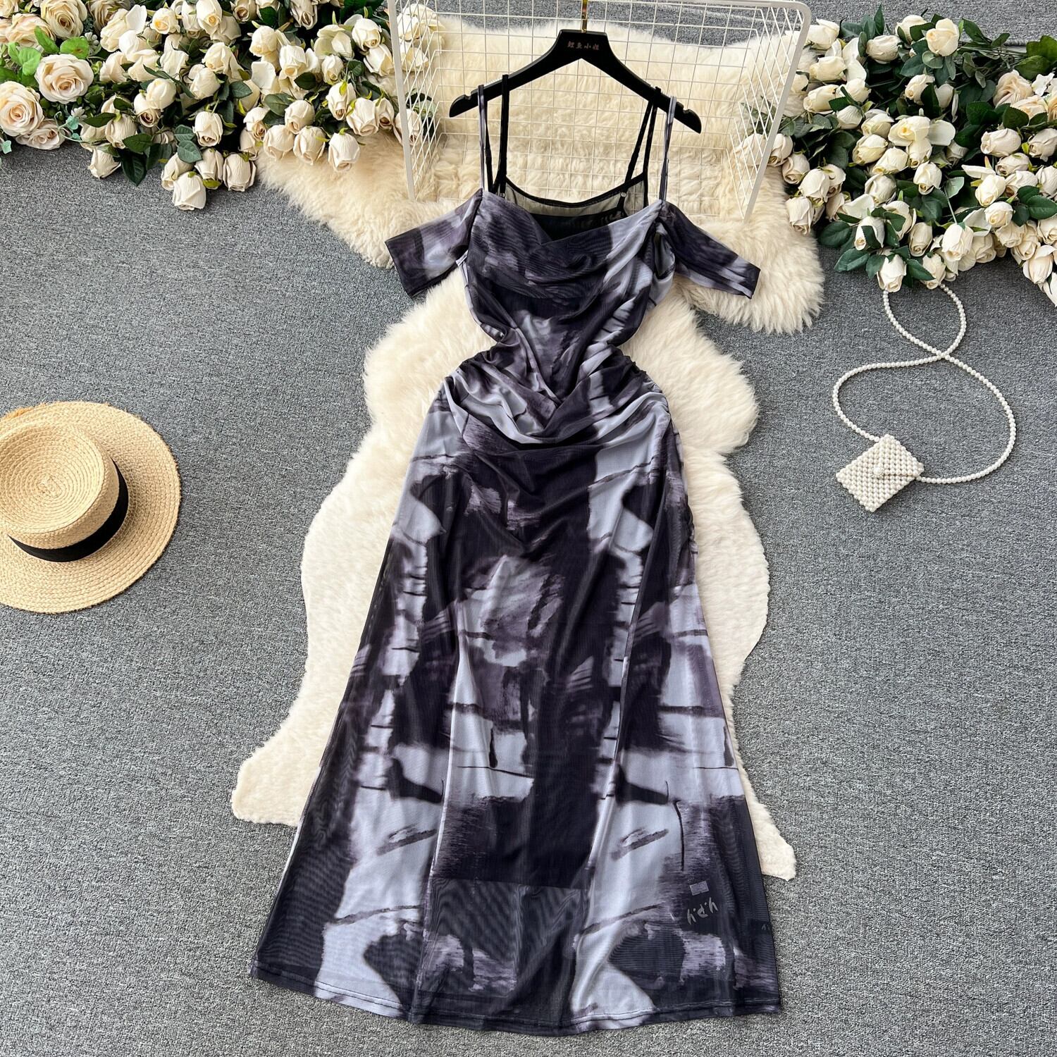 ドーパミン純粋な欲望スタイルレトロ絞り染めサスペンダーチュールドレス女性の夏のオフショルダースリットカラーセクシーな気質ロングドレス サマー 夏物 ピュア lyxaj21280265275