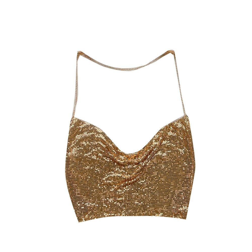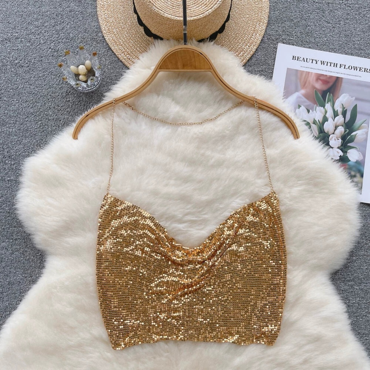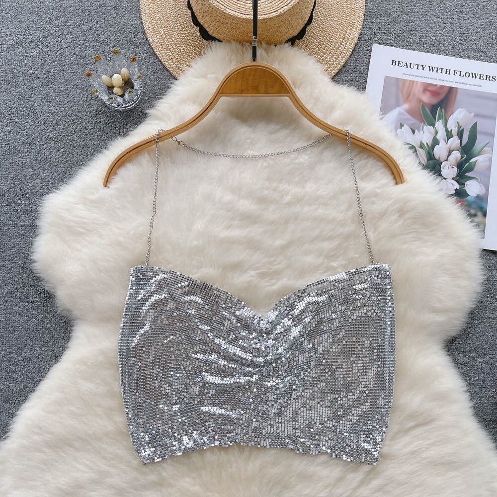 ニッチシックな光沢のあるスイングカラーホルターネック小さなキャミソール女性ナイトクラブセクシーなネクタイ背中の開いたラインストーントップトレンディな lyxaj1404854528