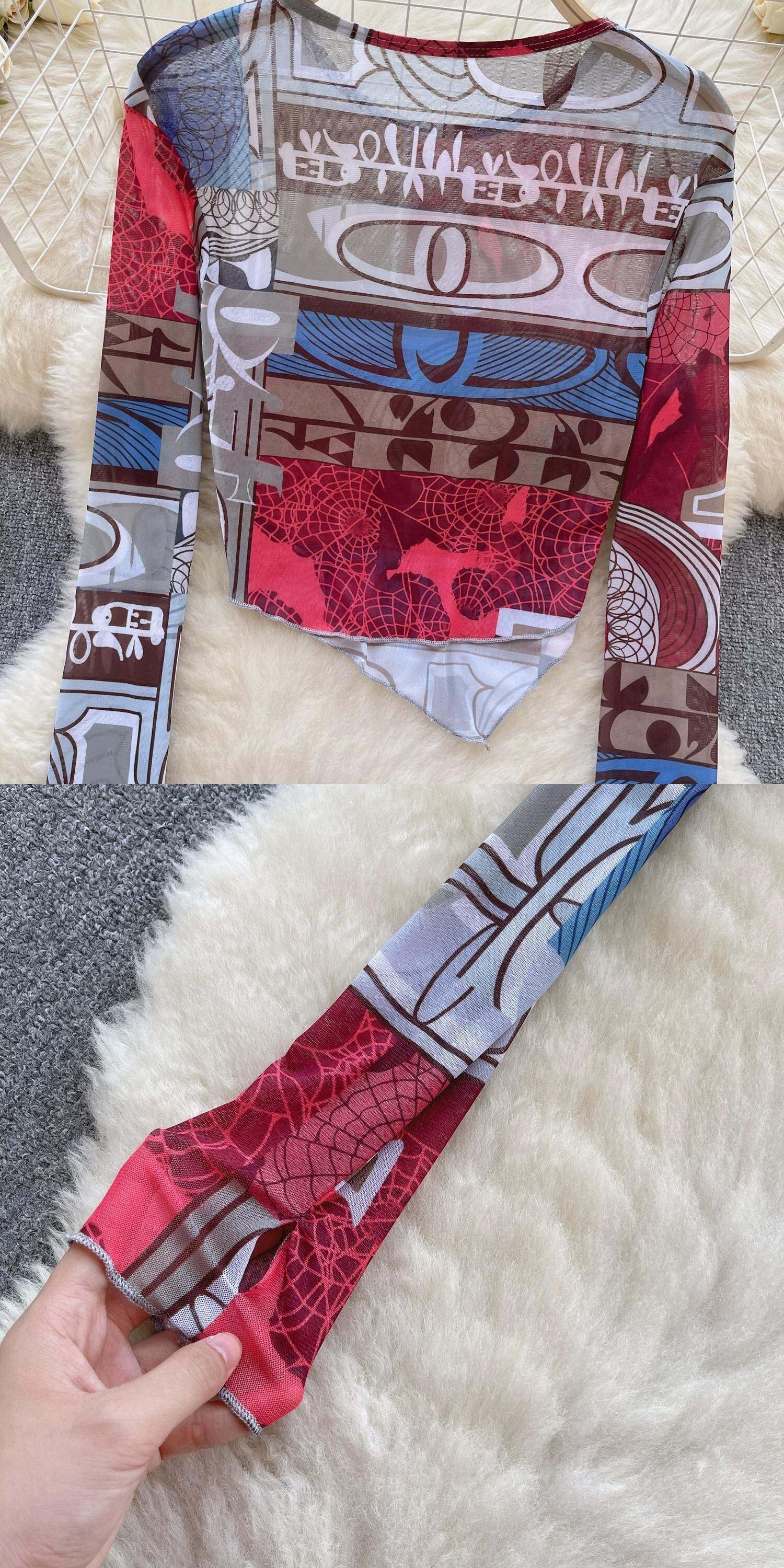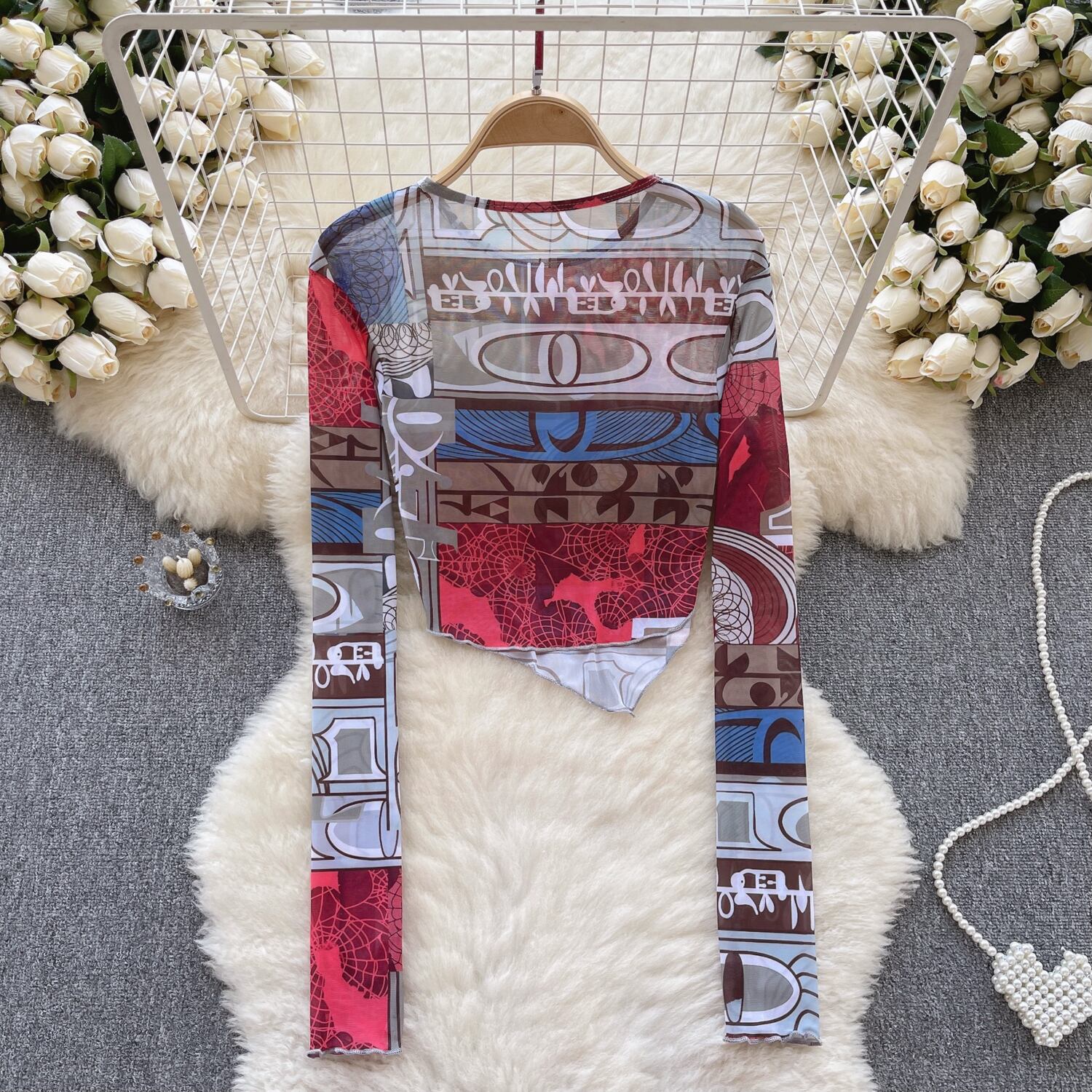 長袖グラフィティプリント不規則なシースルーメッシュTシャツレディース、スリムフィット、ニッチ、シックで多用途なファッショントップス ロング lyxaj14082127734