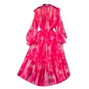 ライトラグジュアリー、ハイエンド、エレガント、スタンドカラー、長袖シフォン花柄ドレスレディース、ウエストスリム、Aラインエレガントな大きな裾スカート ロング lyxaj79445327243