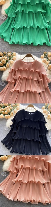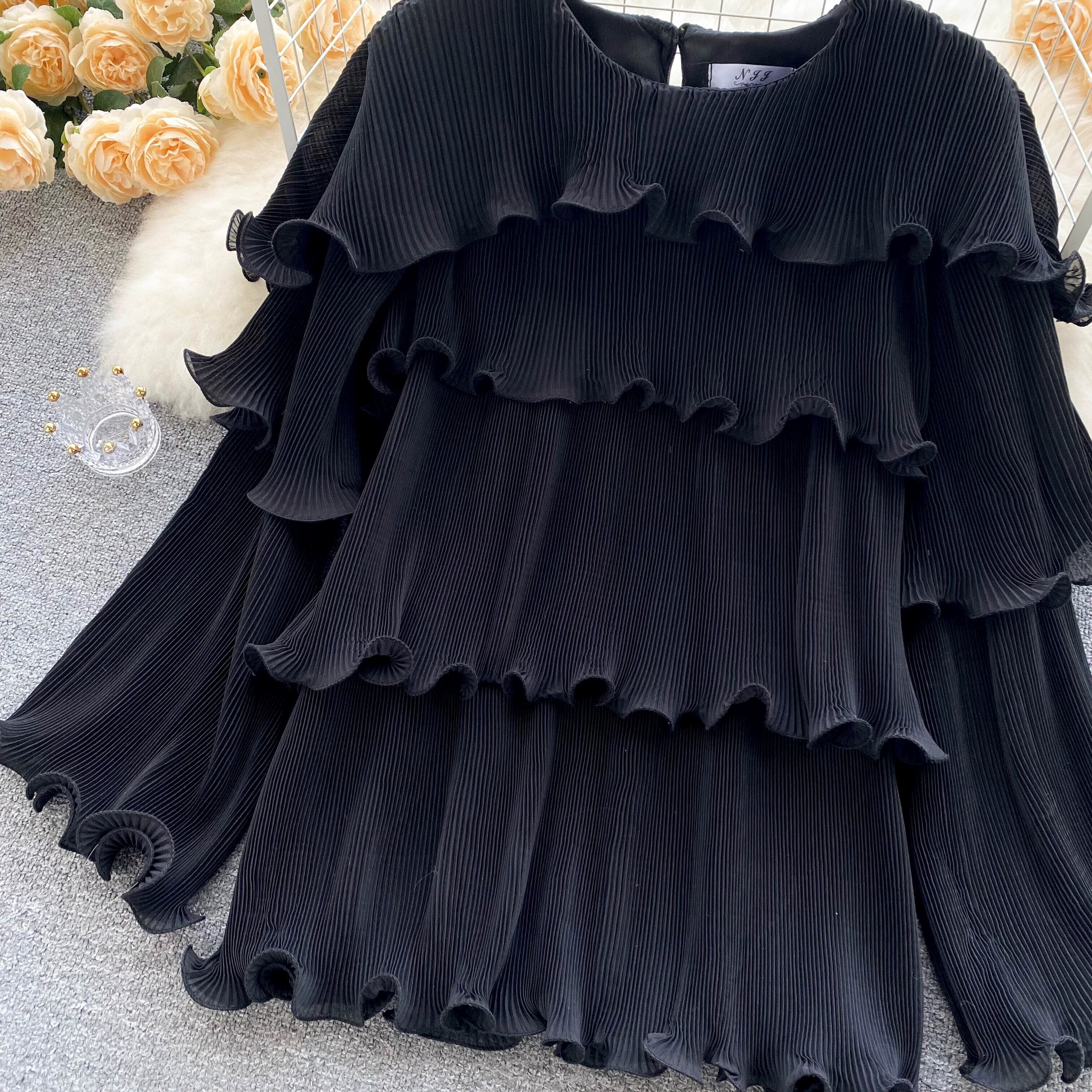 ヨーロッパとアメリカのインシックなデザイントップスファッショナブルなラウンドネックフリルルーズプリーツ気質シフォンシャツトレンディ Oネック ヨーロピアン lyxaj43953636505