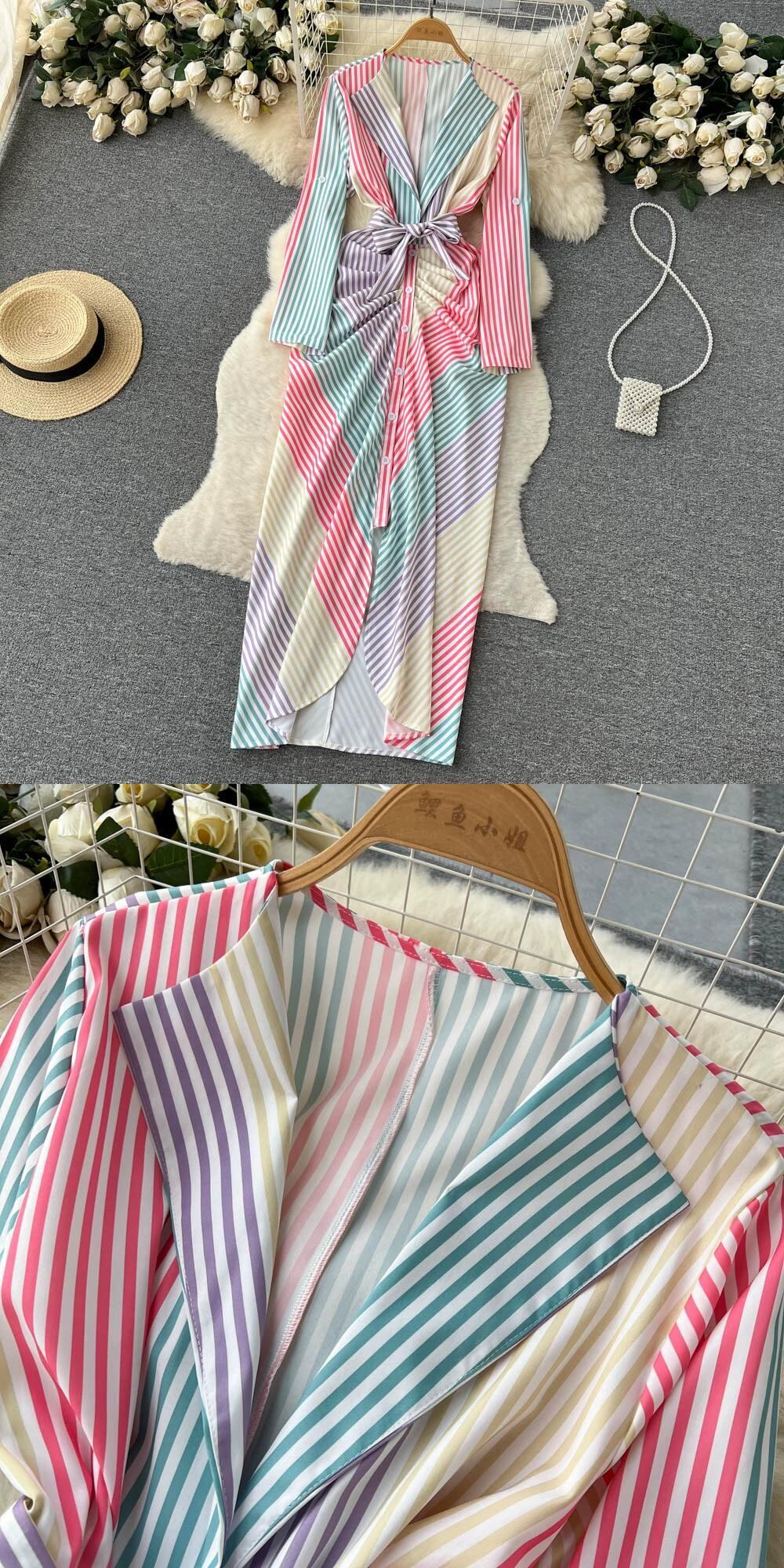 ヨーロッパとアメリカのインスタイルのコントラストストライプVネックドレスレディース長袖プリーツストラップシングルブレスト不規則なヒップカバーロングスカート ヨーロピアン lyxaj57085976870