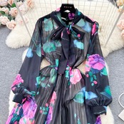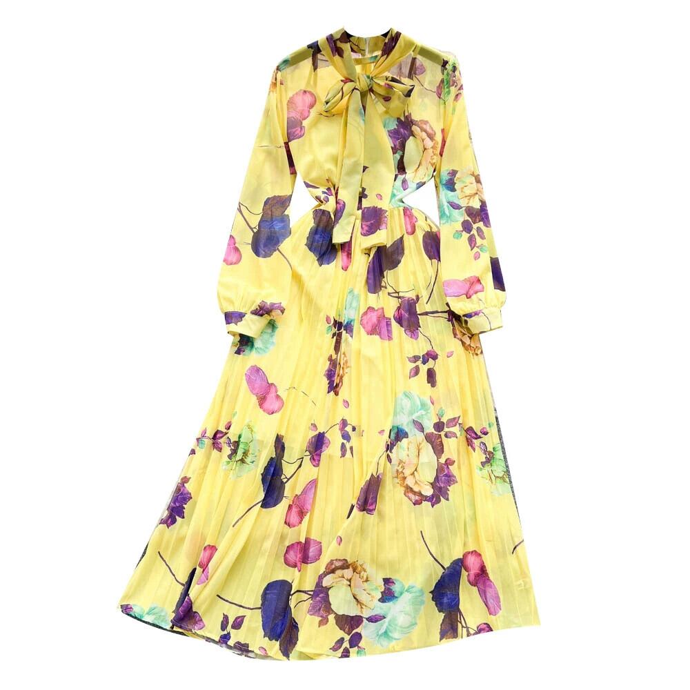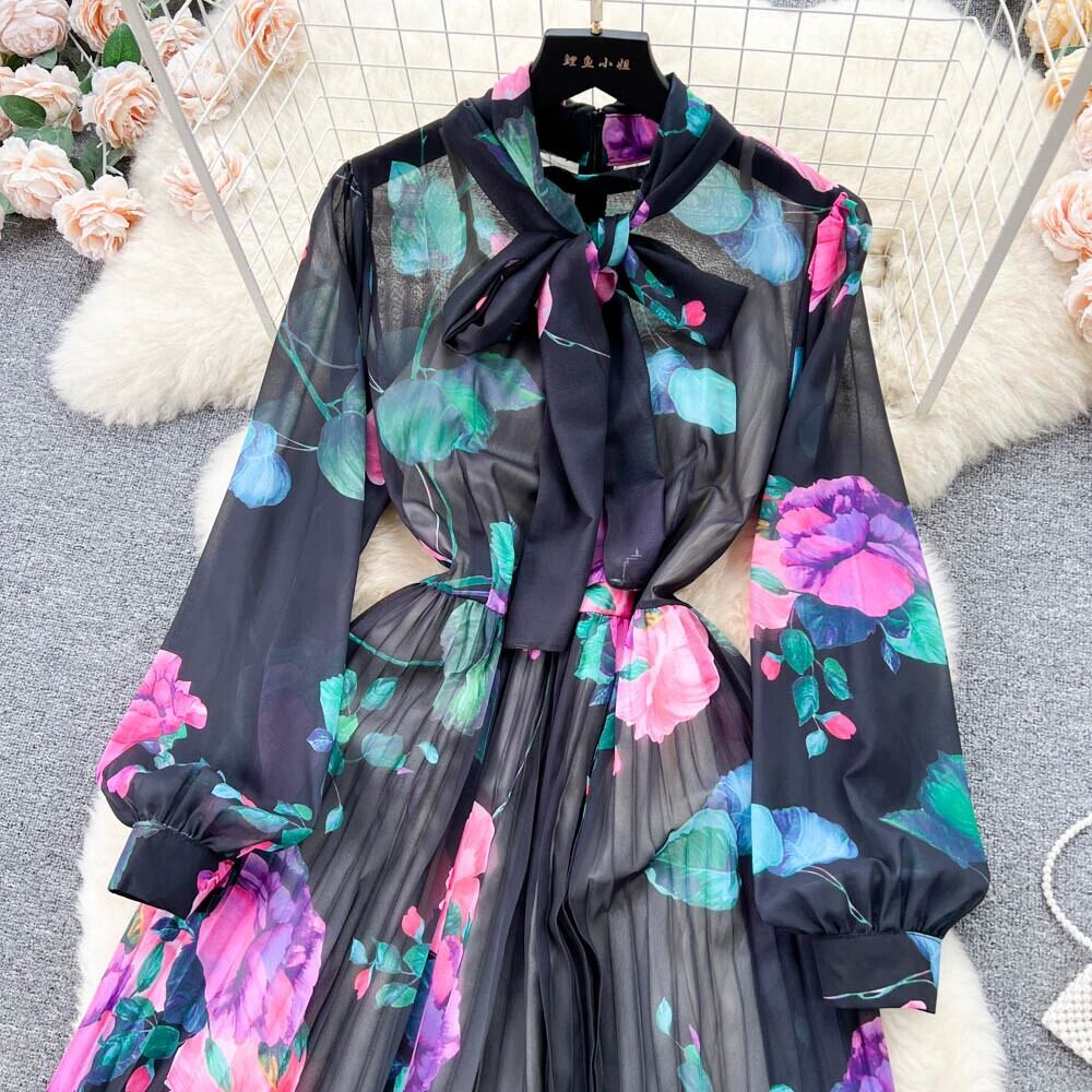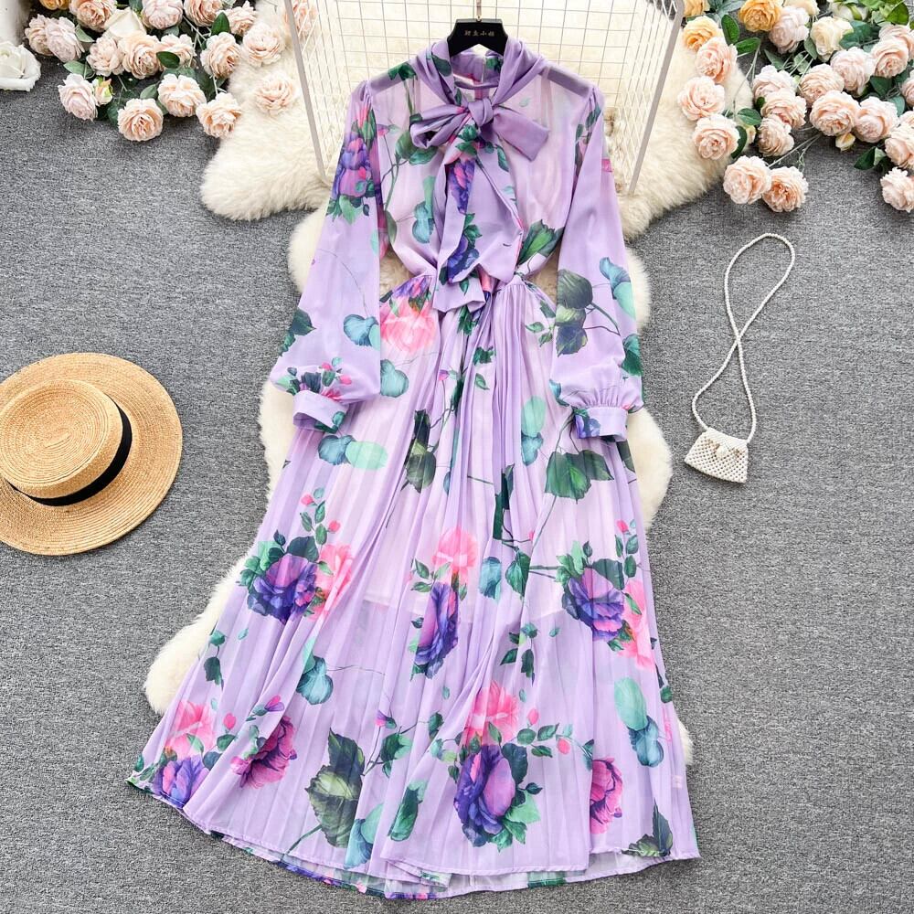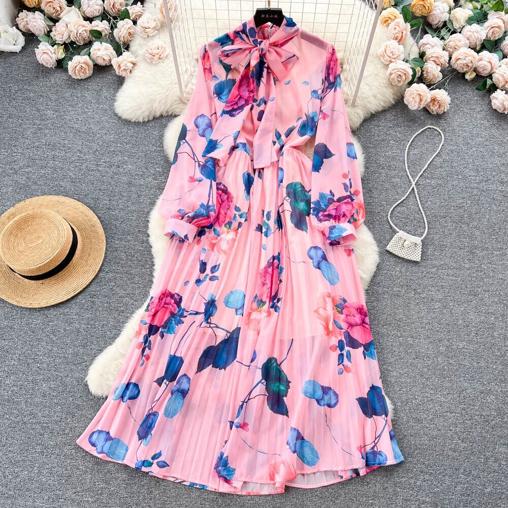 夏の海辺のリゾートスタイルの花柄シフォンロングスカート女性蝶ネクタイウエスト痩身長袖プリーツドレス リボン サマー 夏物 lyxaj79567376587