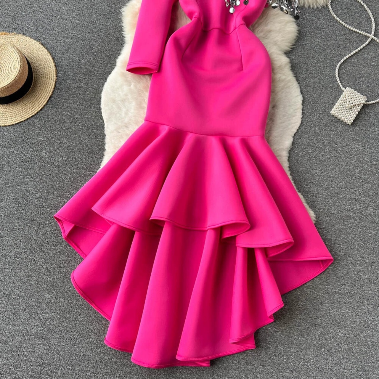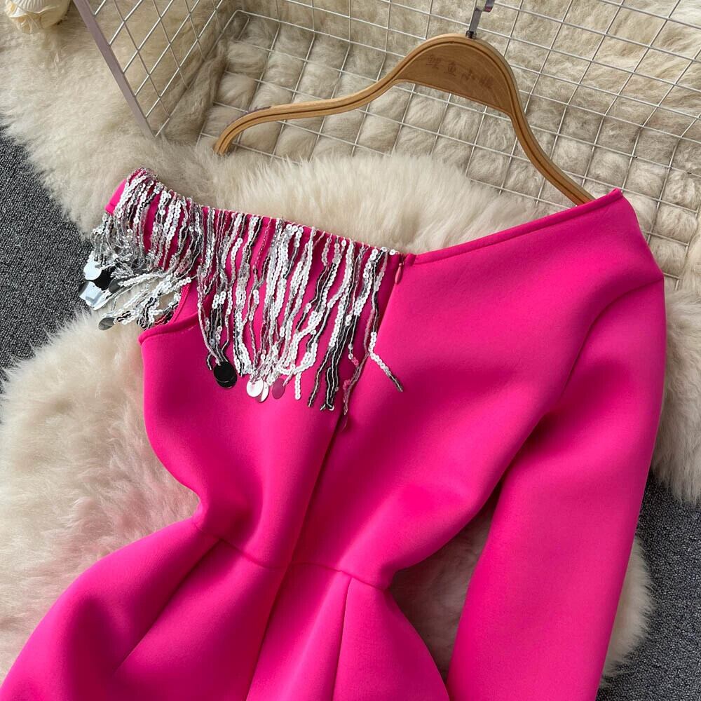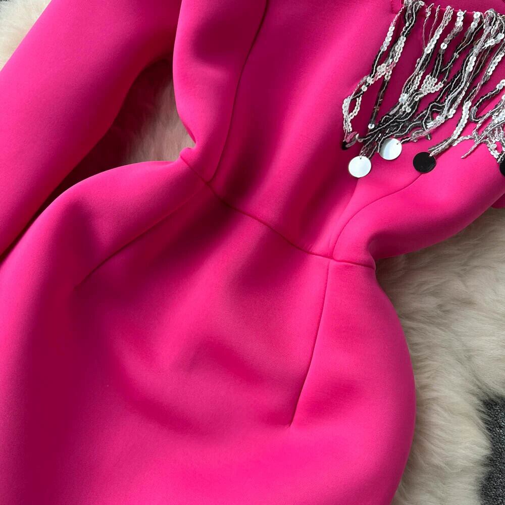 フランス製の丈夫なテルスパンコール不規則なデザインのワンショルダーバッグヒップフリルミッドレングスのイブニングドレス lyxaj38846206336