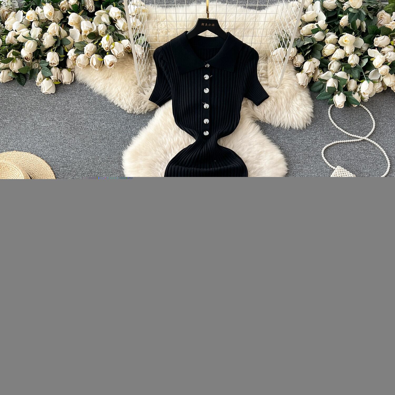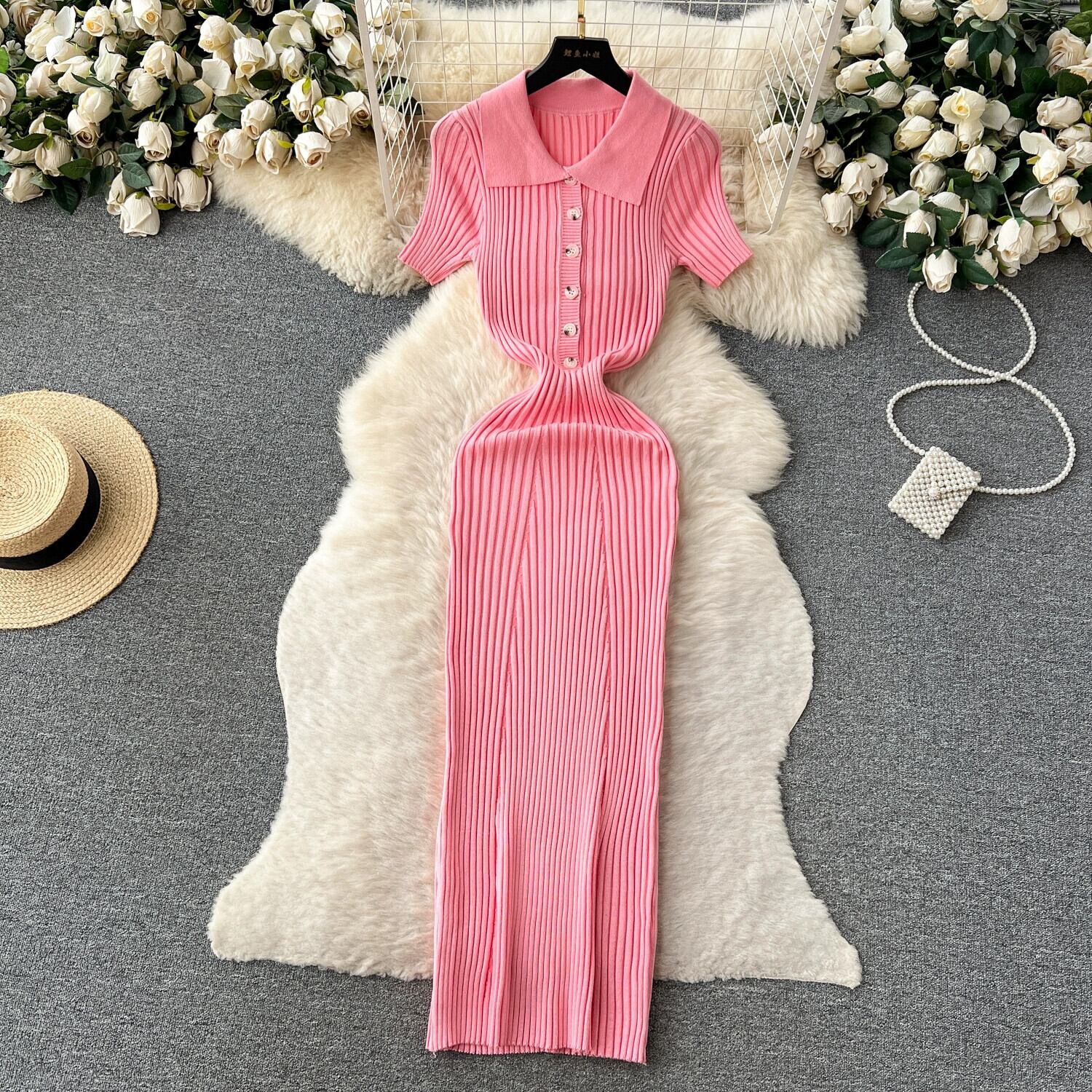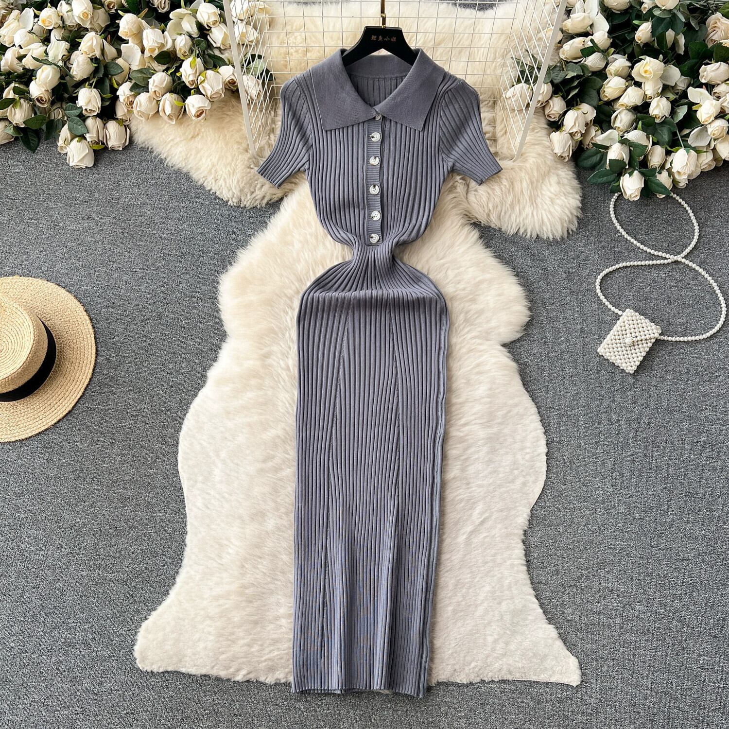 レトロヘボンスタイルハイエンドソリッドカラーニットドレス女性の夏のスリムデザインニッチシックな気質ロングスカート サマー 夏物 lyxaj34297952425