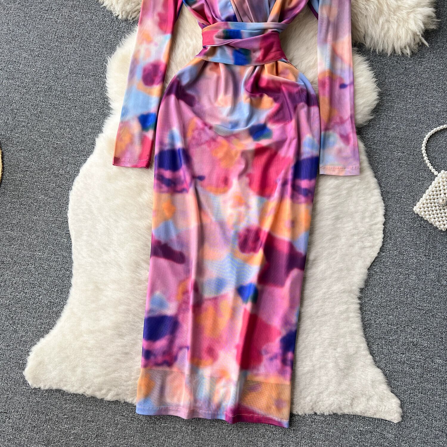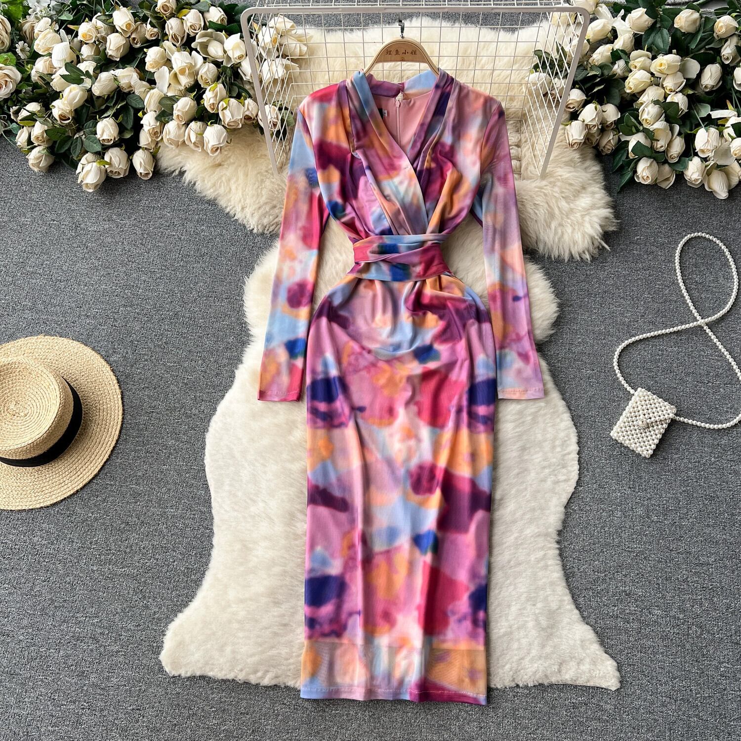 セクシーな高級スタイル絞り染めドレスの女性の春と夏の長袖スリットウエストストラップデザインスリムドーパミンスカート ロング スプリング 春物 サマー 夏物 lyxaj93453113309