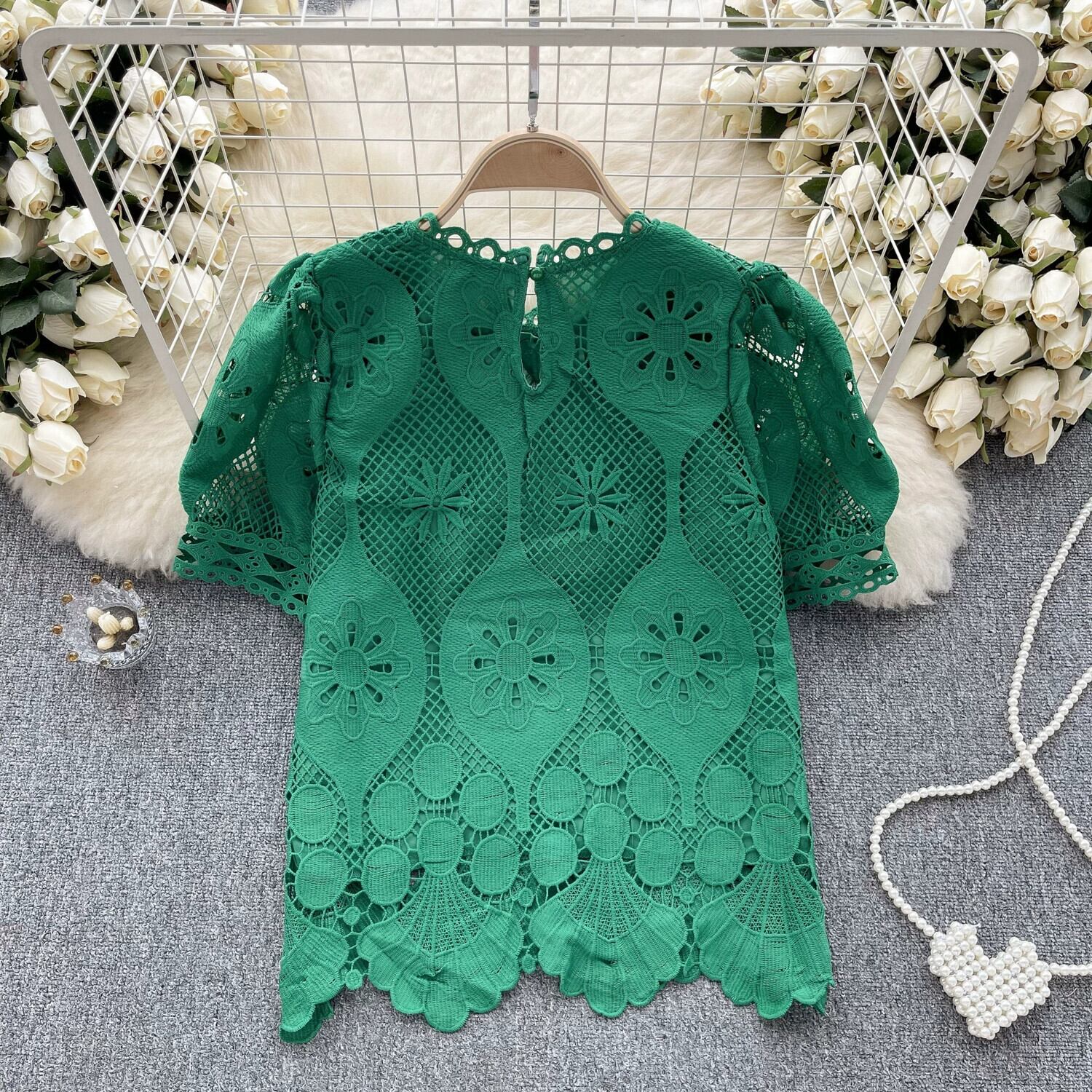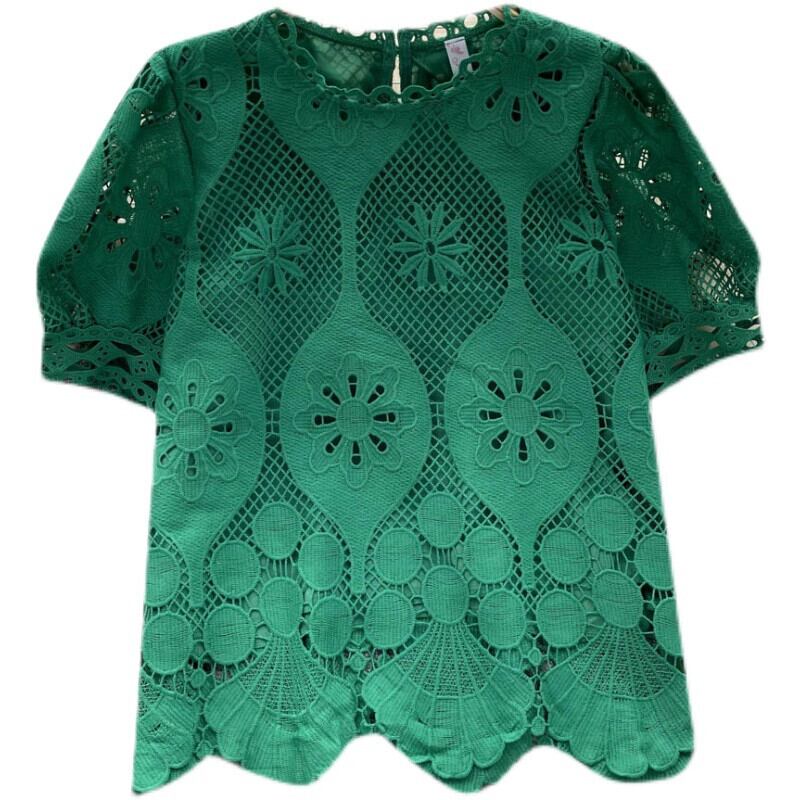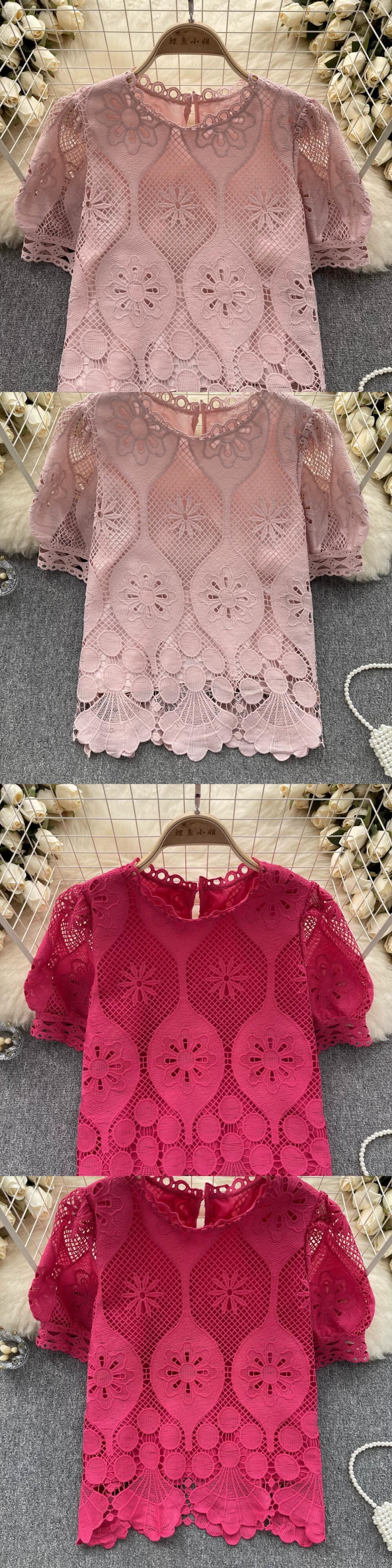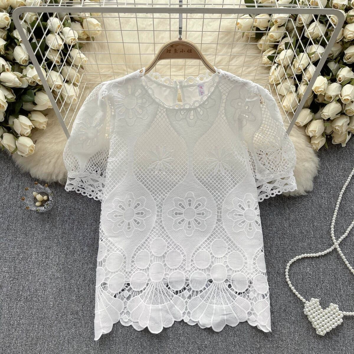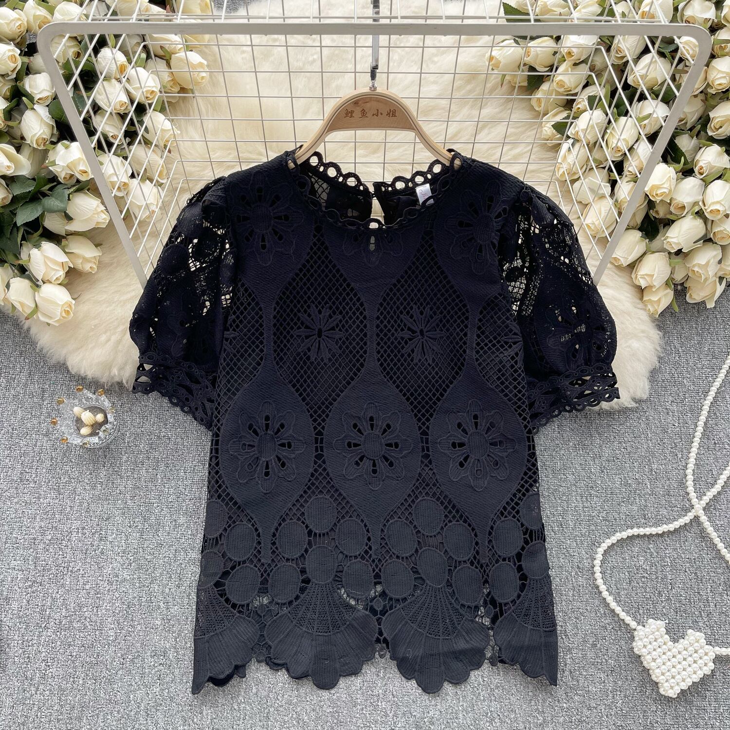 夏の新しいレトロなニッチデザインニット中空レーストップ女性のスプライシングシースルーレース半袖Tシャツ サマー 夏物 lyxaj6308256298