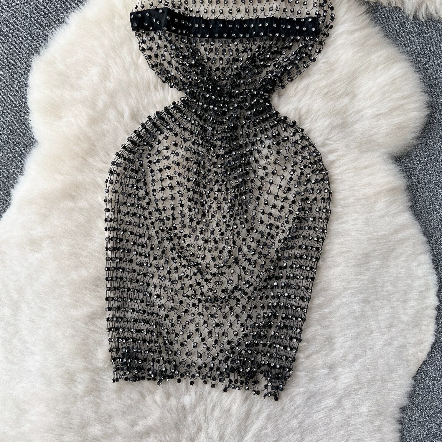 セクシーな純粋な欲望スタイルホルターネックドレス女性の夏中空明るいダイヤモンド網タイツバックレスデザインヒップハグショートスカート サマー 夏物 ピュア lyxaj39631511787
