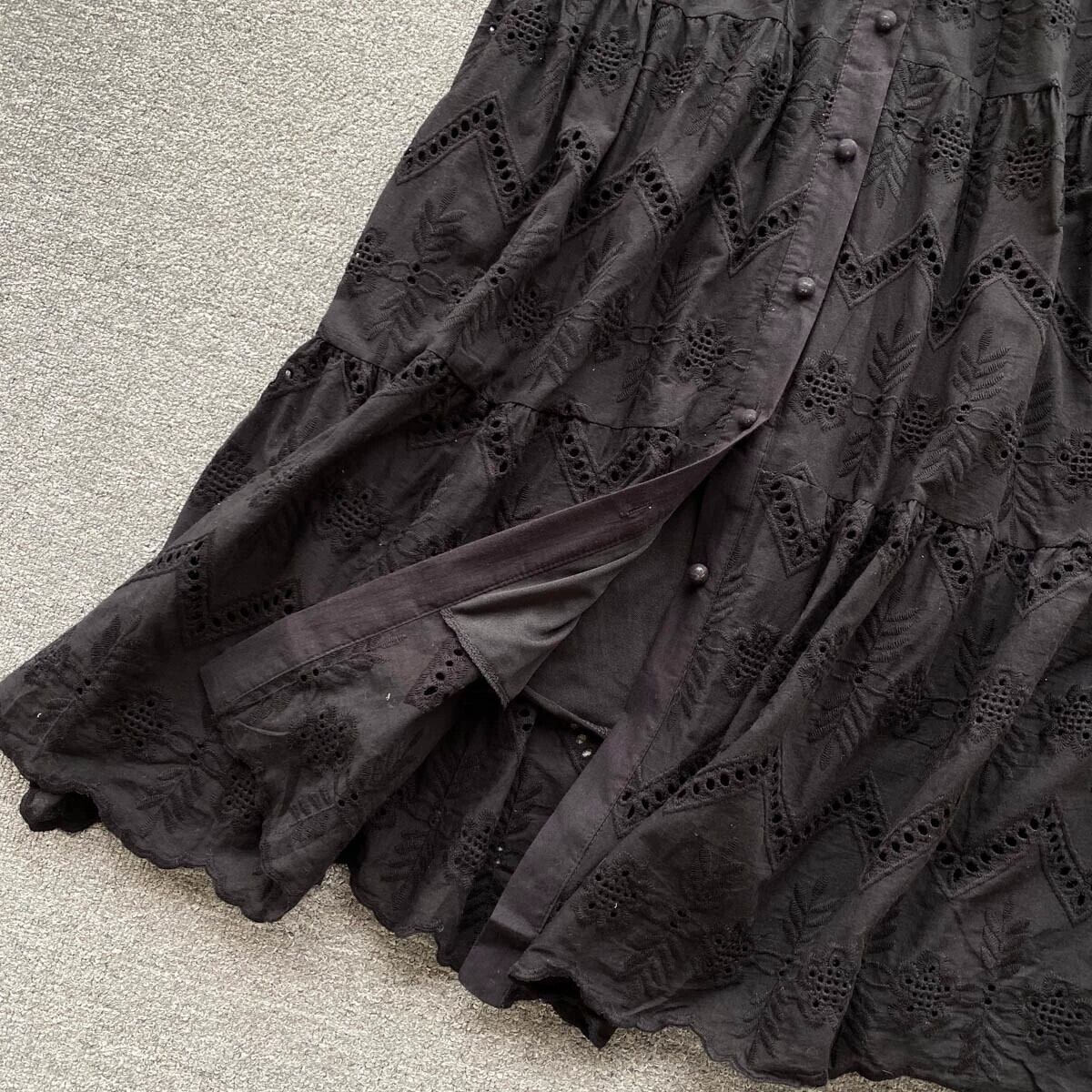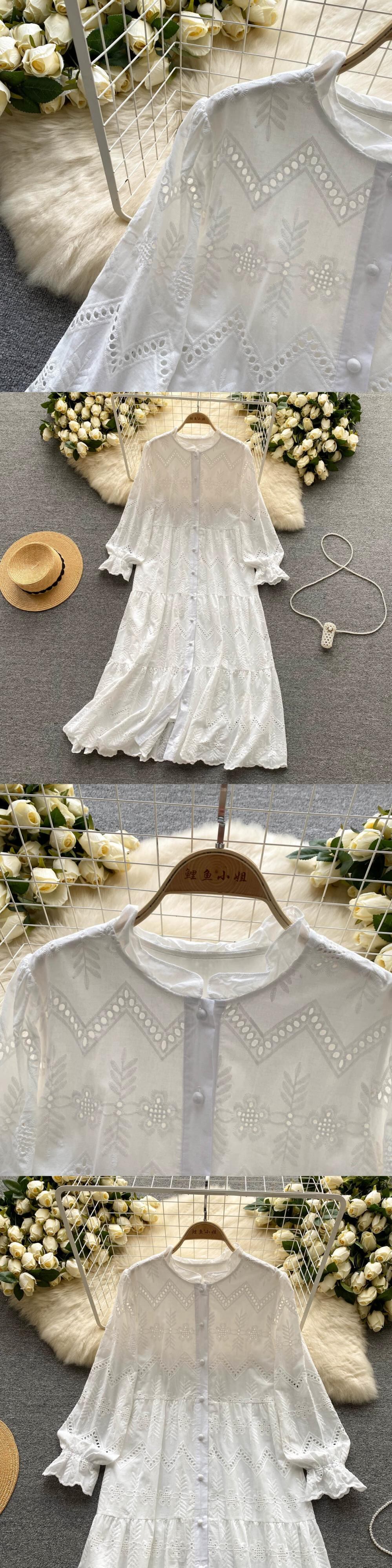 ese 甘くて優しいレース中空長袖ドレス女性フレンチニッチシングルブレストシックなミドル丈スカート ロング 大人ガーリー スウィート キュート カジュアル lyxaj69050651566