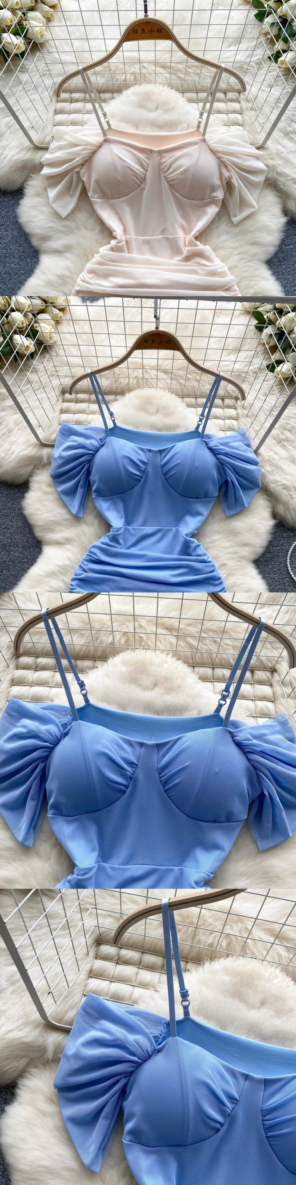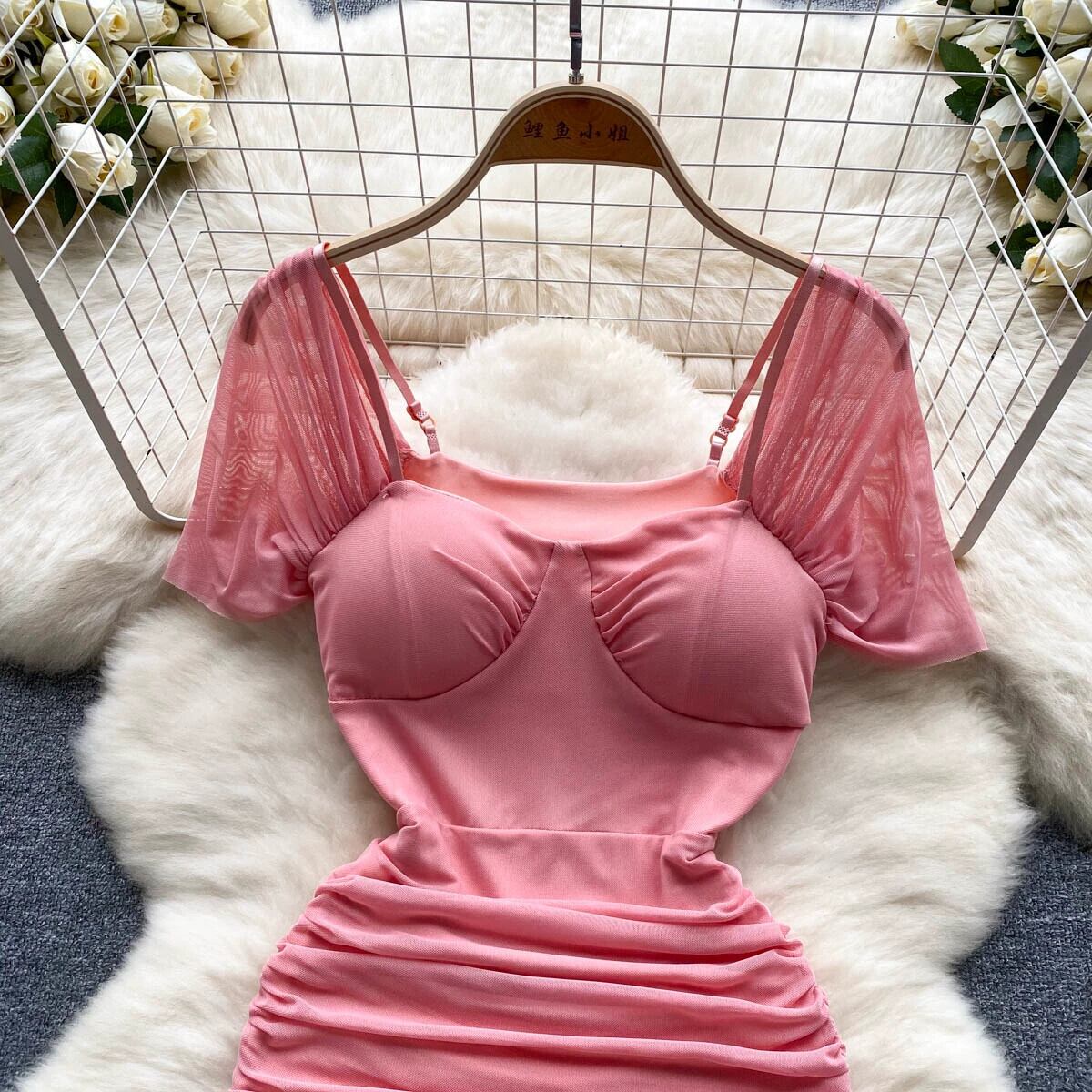 純粋な欲望スタイルのセクシーなプリーツソリッドカラーメッシュサスペンダーストラップレスドレスプリーツウエスト痩身胸パッド入りヒップスカート lyxaj80096130456