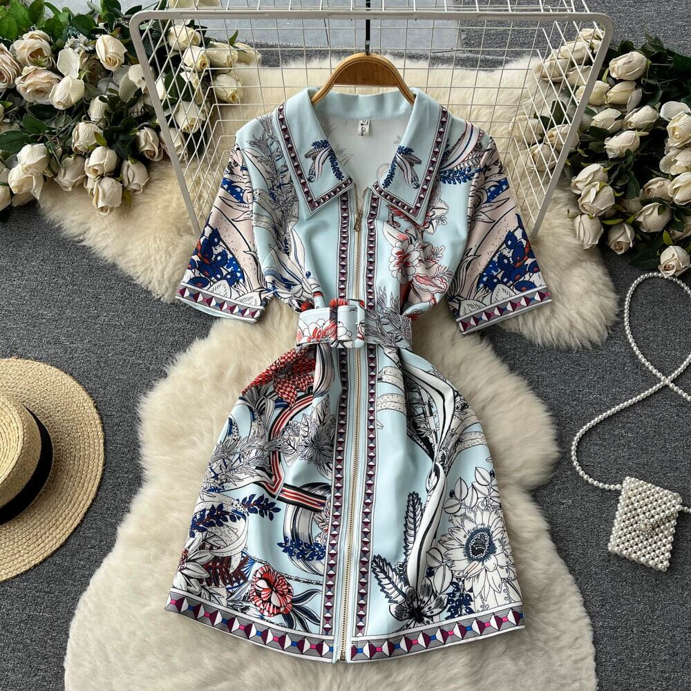ヨーロッパとアメリカのレトロな気質のラペルジッパー半袖ドレス、スリムなウエストとスリムな気質のAラインプリントの高級スカート ヨーロピアン lyxaj47259483103