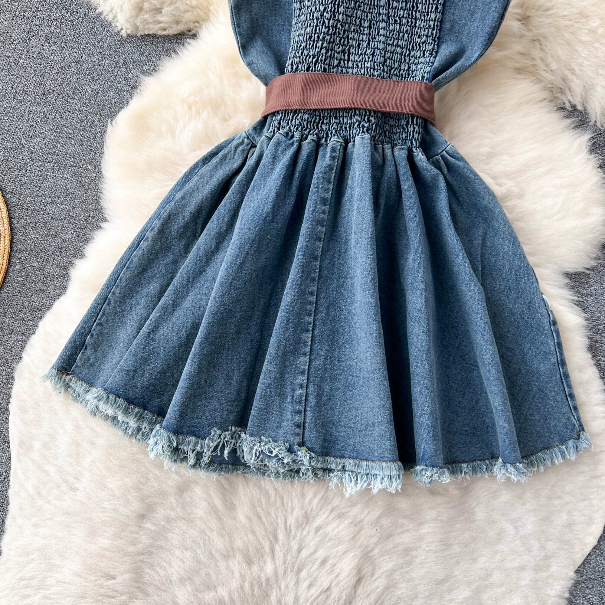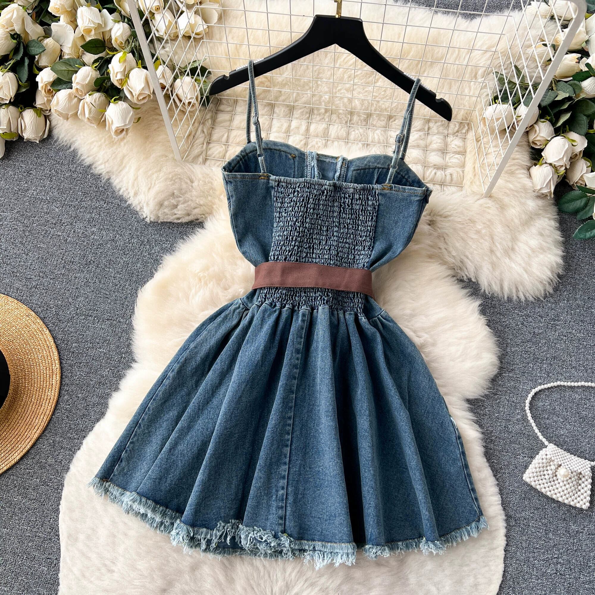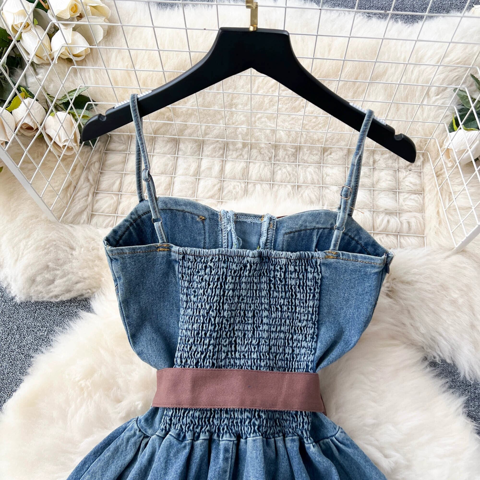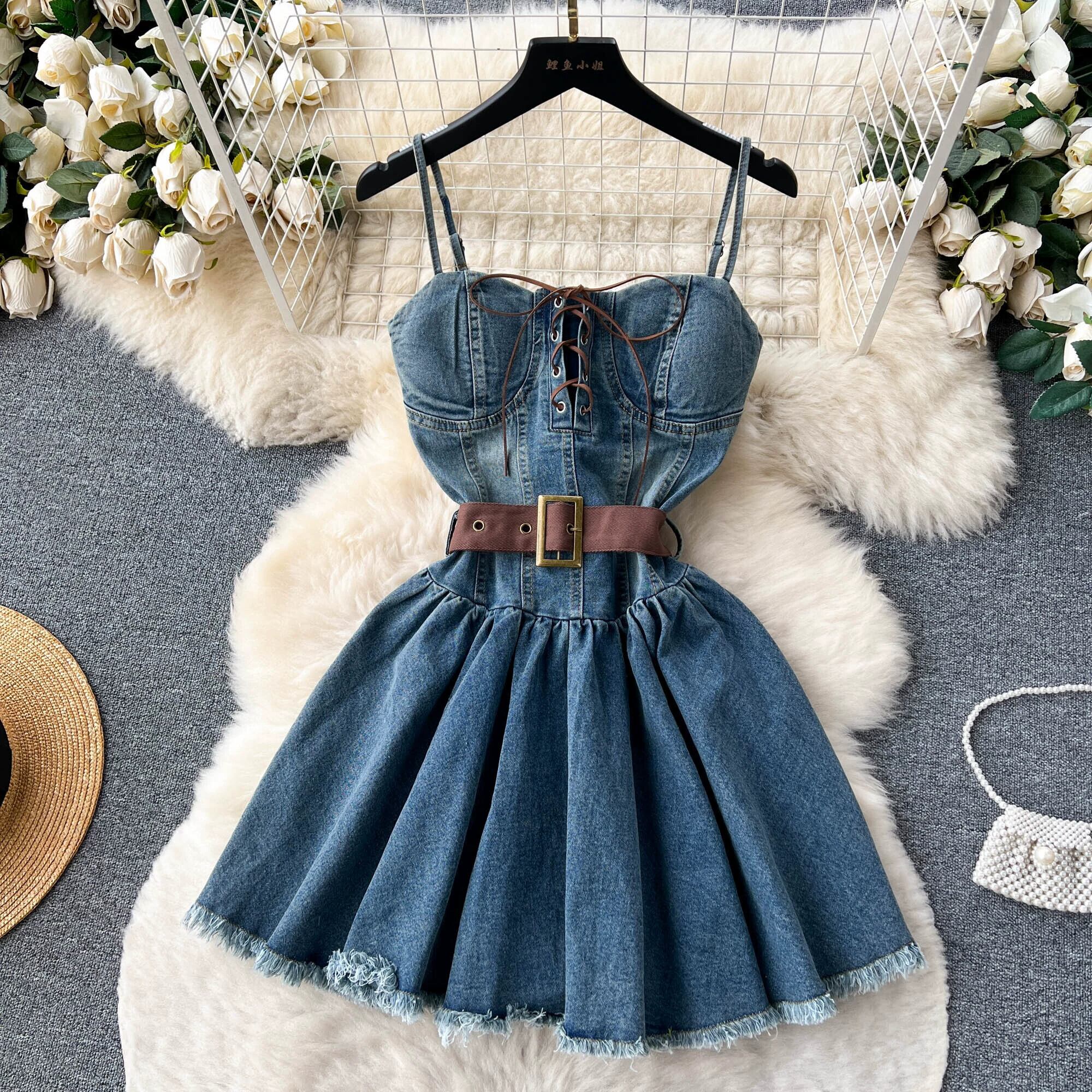 アメリカンレトロな気質ストラップデザインストラップレスデニムスカート女性の夏のウエストを締める気質プリーツドレス サマー 夏物 lyxaj13783463423
