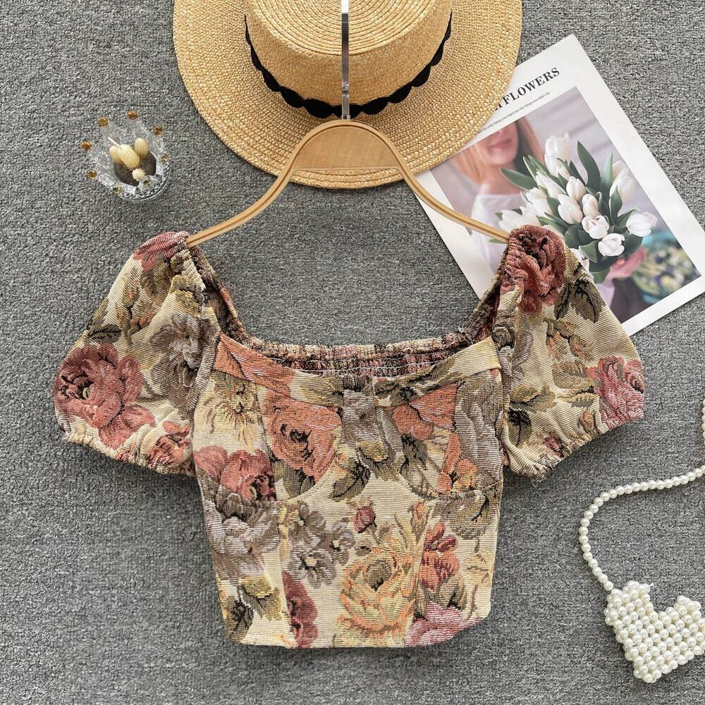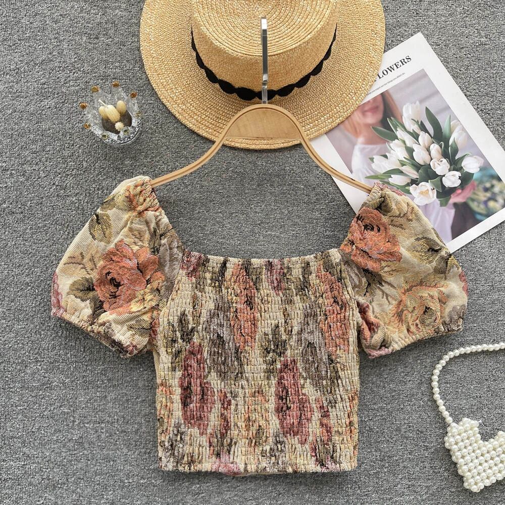 ピュアスタイルワンラインカラーショートシャツ夏フレンチレトロパフスリーブジャカード刺繍へそ露出セクシートップ サマー 夏物 lyxaj92979037031
