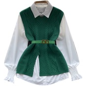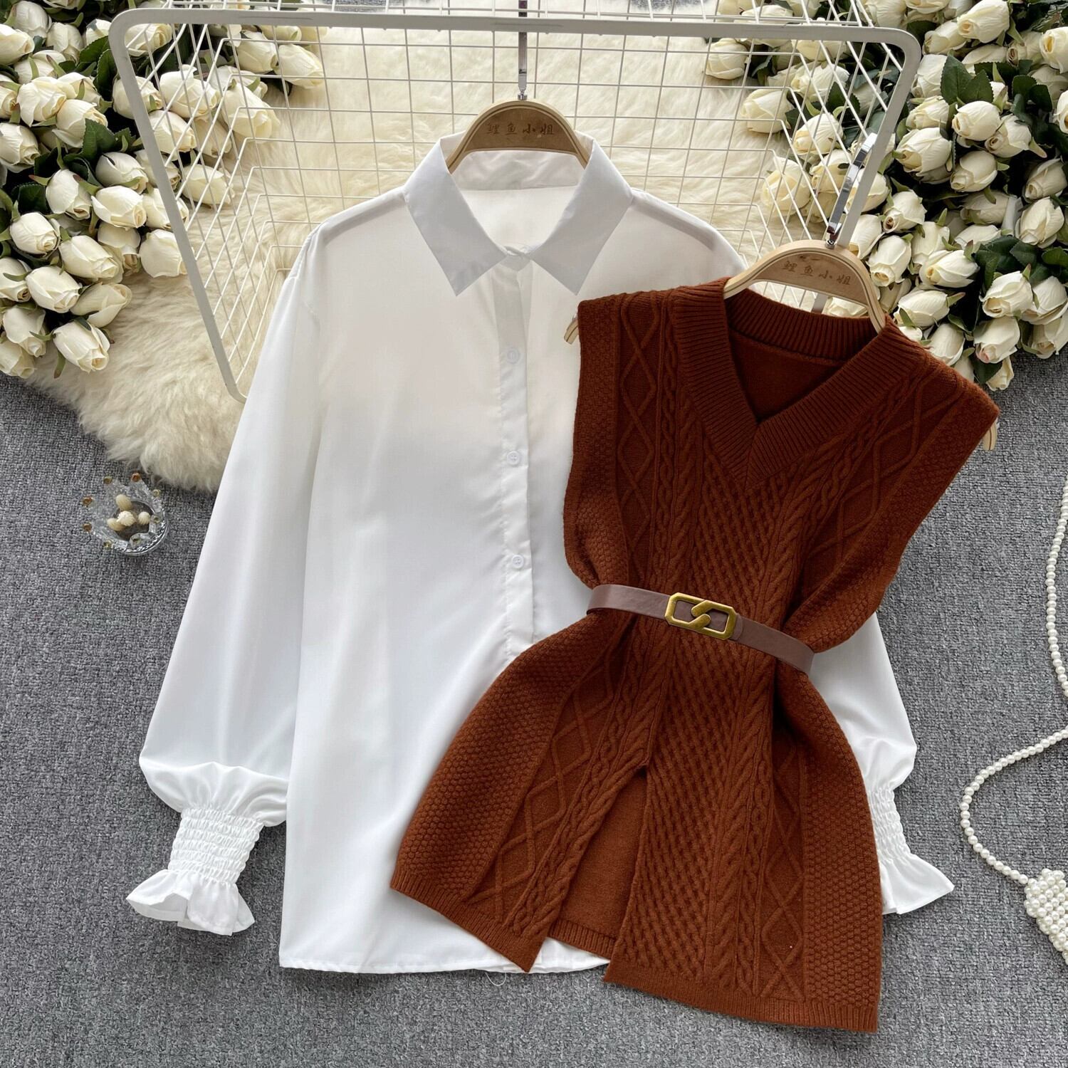 スタイルスタイリッシュスーツレディースカジュアルルーズ長袖シャツ+ウエストVネックノースリーブニットベスト2点セット ロング lyxaj78464645130