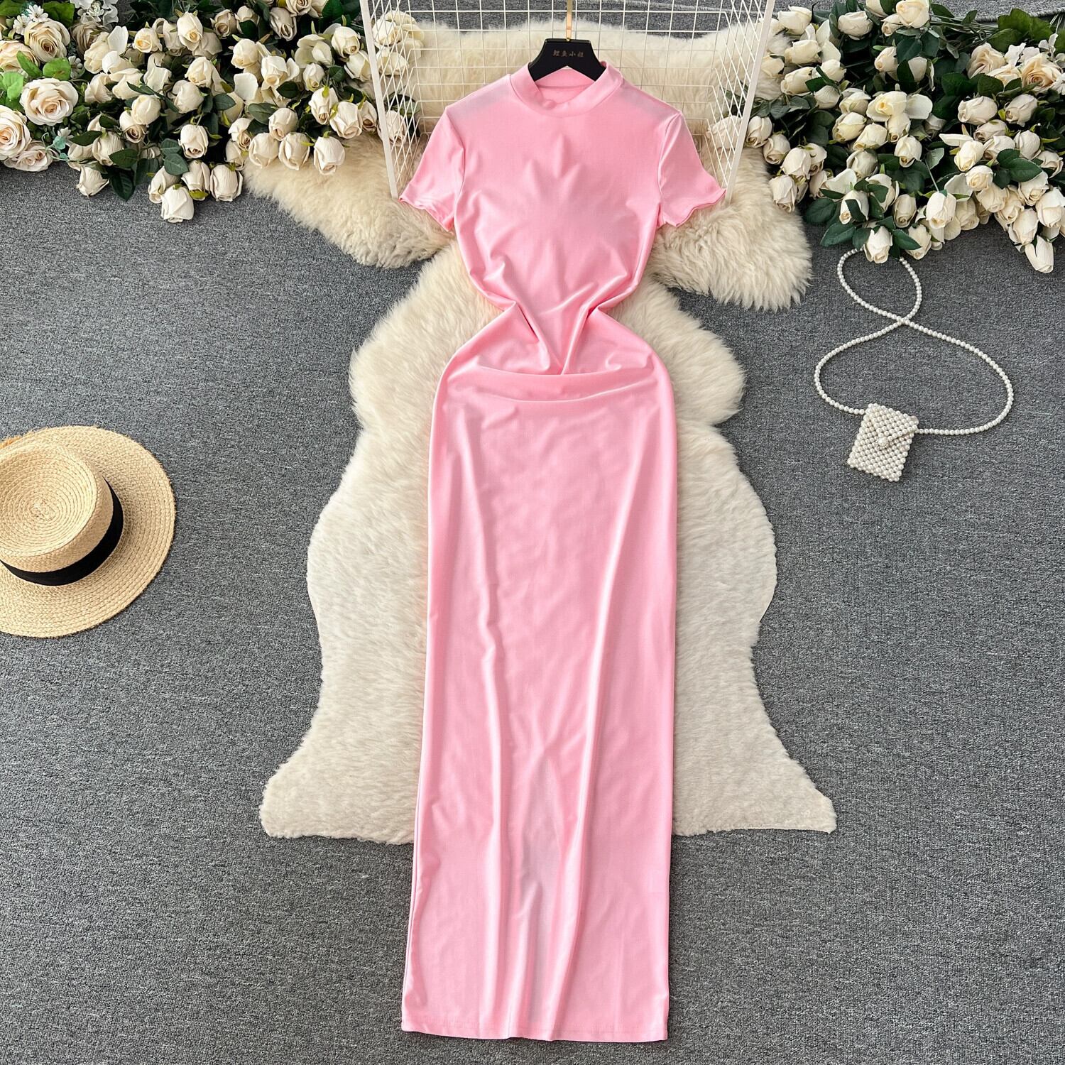 ヨーロッパとアメリカのスタイルのファッショナブルな無地のハーフハイカラー半袖ドレス、女性らしい純粋な欲望、スリムフィット、ヒップを包み込むロングスカート ピュア ソリッドカラー ヨーロピアン lyxaj93022154275