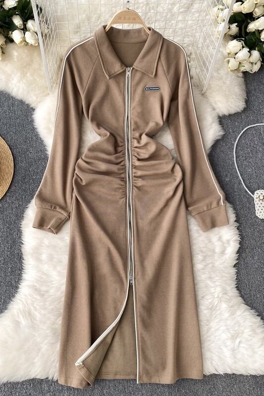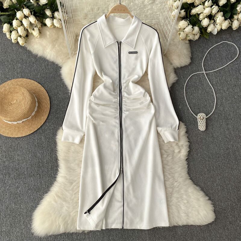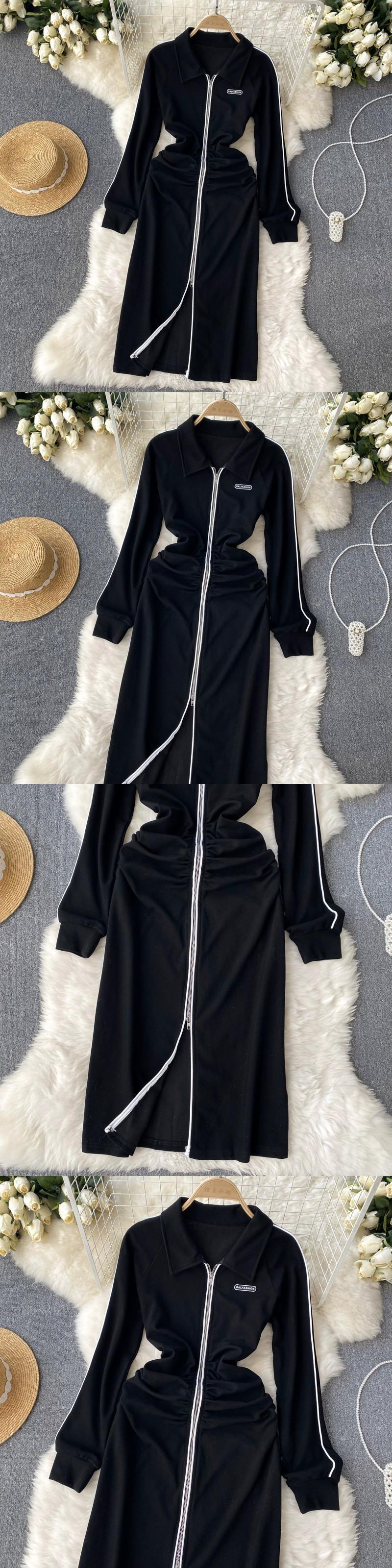 アメリカのレトロなスタイルの春と秋のハイエンドラペルジッパープリーツヒップカバーロングスカートの女性は、対照的な色と気質のトレンディなドレスを持っています スプリング 春物 オータム 秋物 lyxaj50422892390