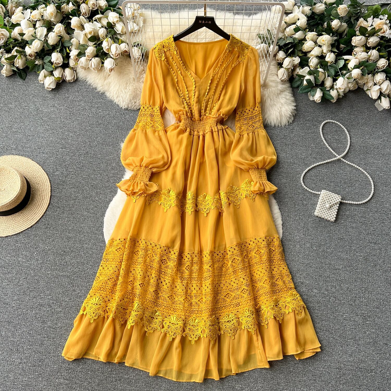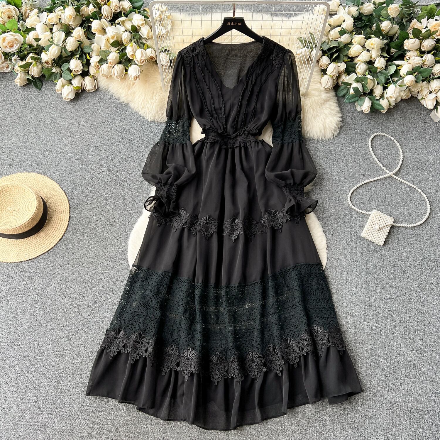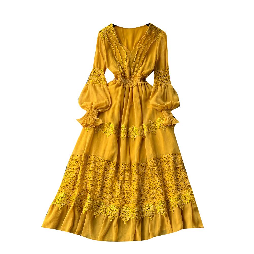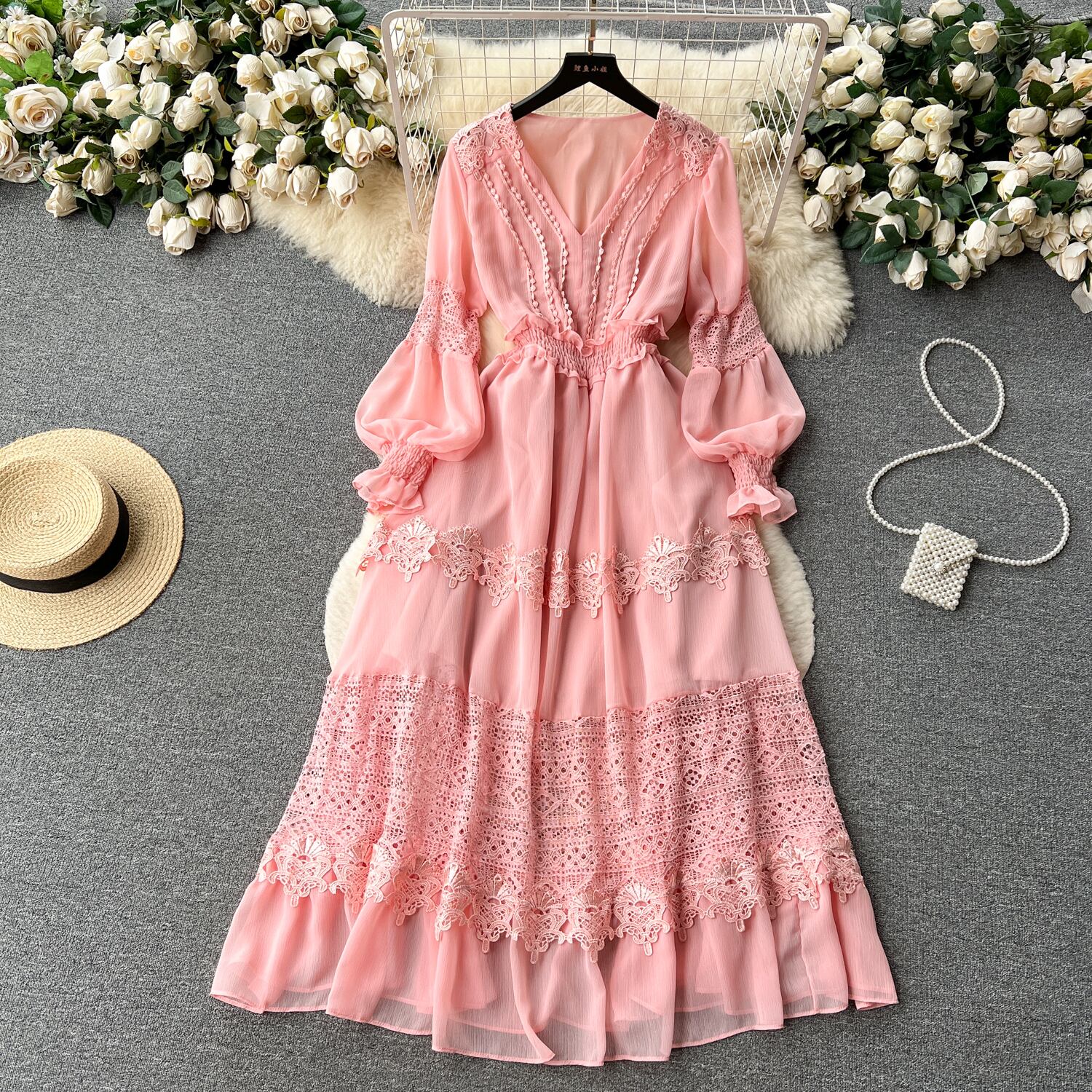 ヨーロッパステーション重工業スプライシングかぎ針編みレース V ネックドレス女性の夏中空大きなスイングメッシュウエストロングスカートトレンディな サマー 夏物 Vネック ヨーロピアン lyxaj79313892595
