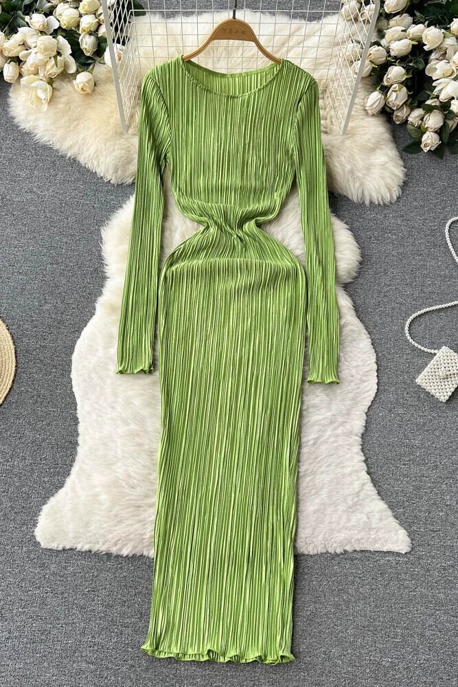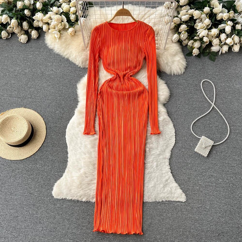 ヨーロッパとアメリカンスタイルの 2022 秋の新ファッションプリーツカジュアル無地ラウンドネック長袖スリムプリーツヒップドレス ロング オータム 秋物 Oネック ソリッドカラー ヨーロピアン lyxaj47536177051