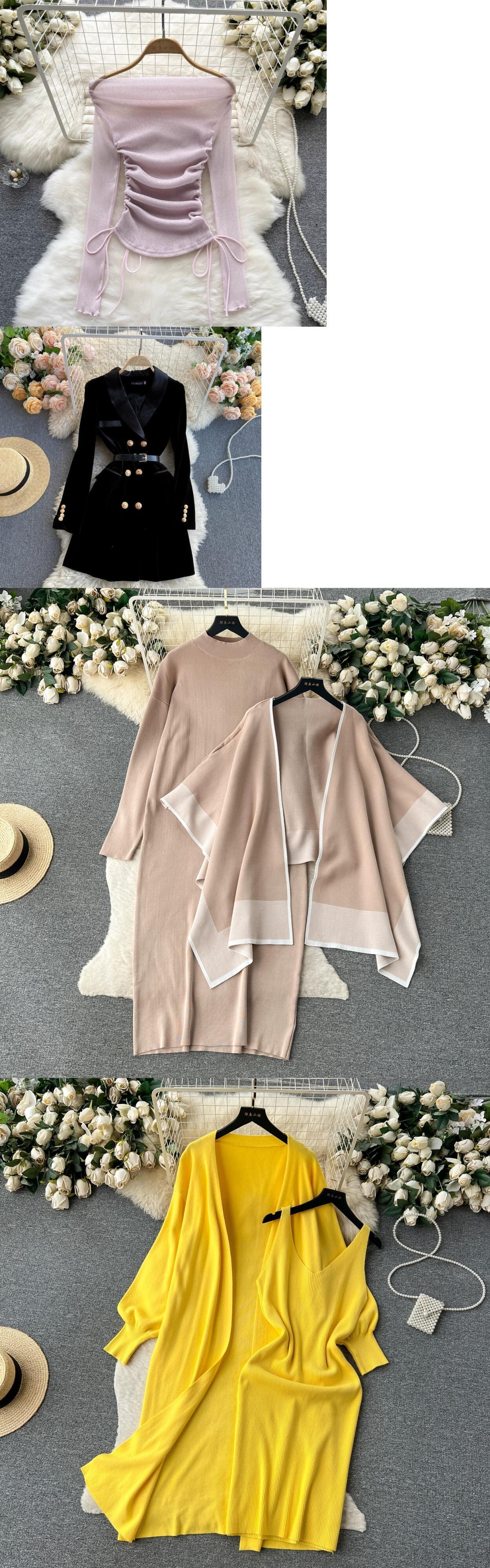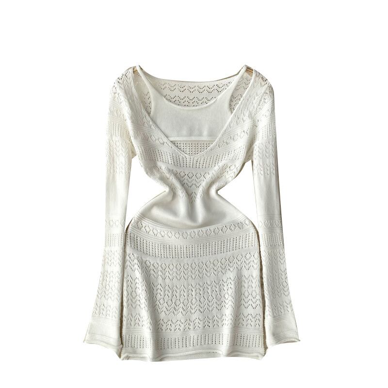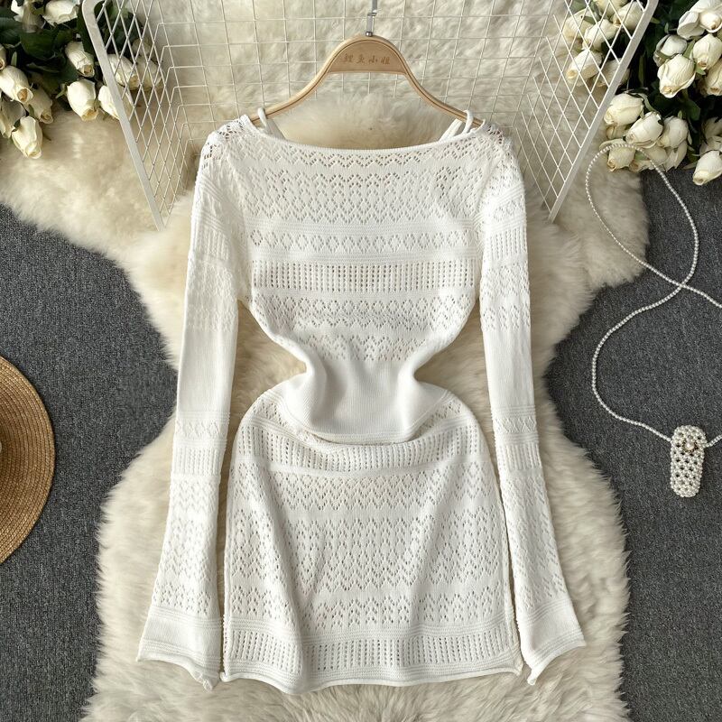 フランス風の高級な気質の中空長袖ニットドレスの女性はウエストをスリムにし、ヒップを抱き締める純粋な欲望スタイルのショートスカート ロング ピュア lyxaj9521530158