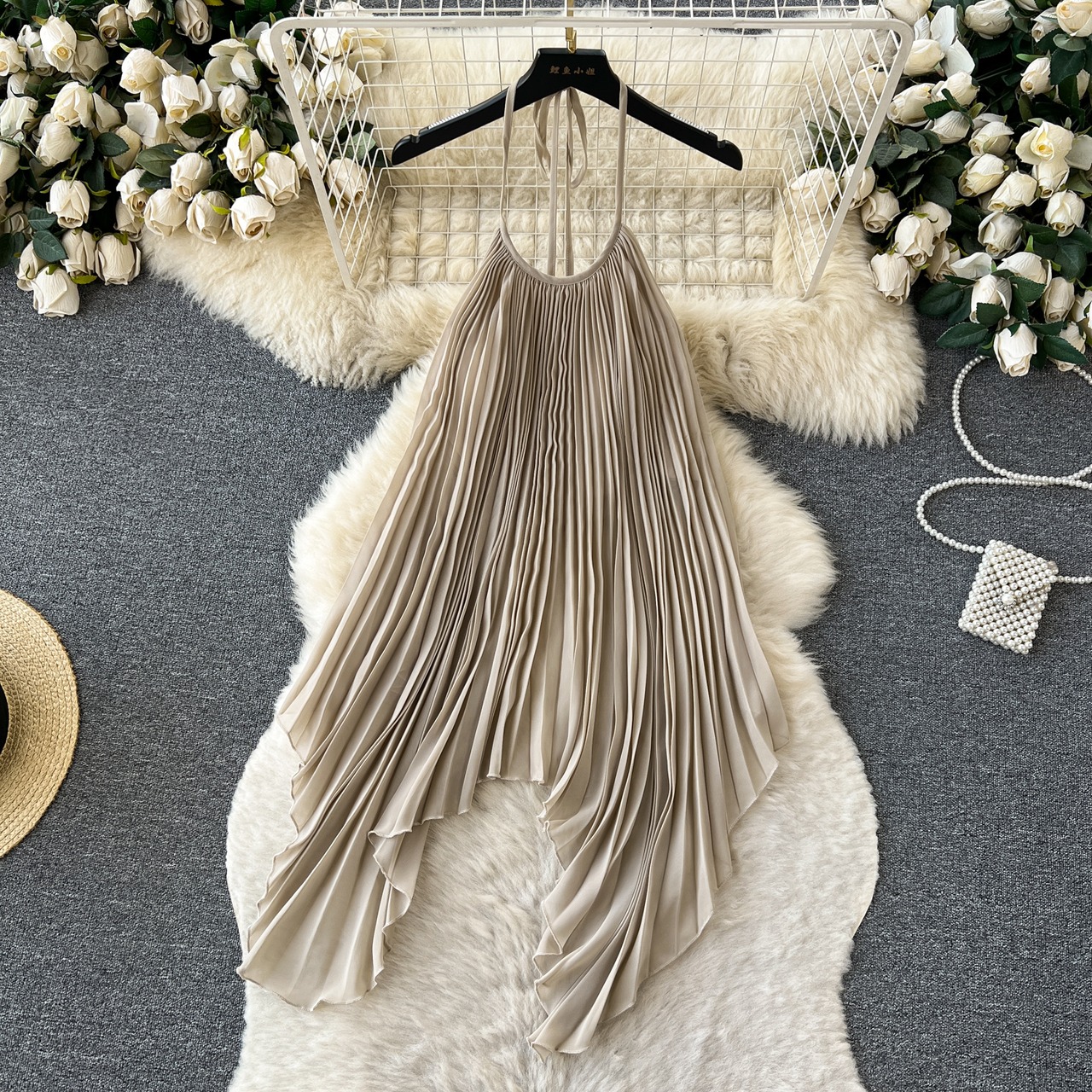 ドーパミン海辺休暇ファッションスーツ女性の夏ホルターネックプリーツキャミソール + ハイウエストミドル丈スカート ハイウェスト サマー 夏物 lyxaj743885009