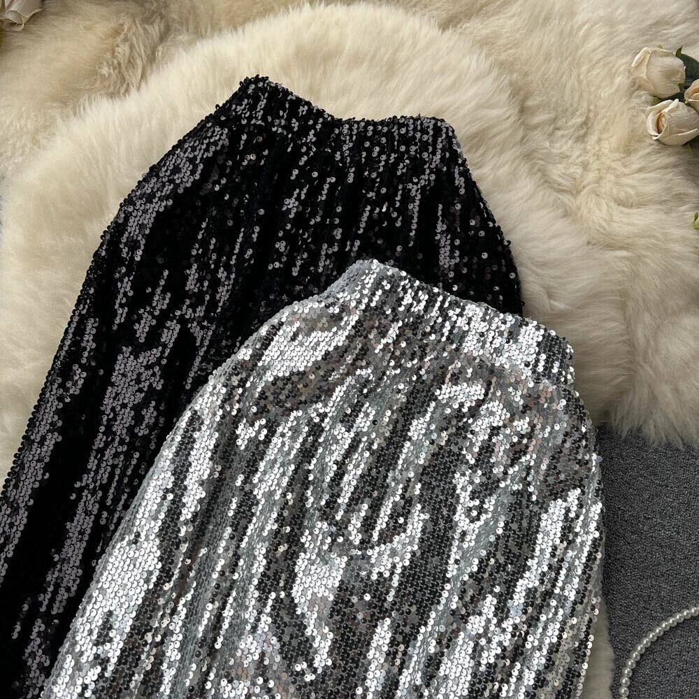 ニッチデザインスパンコールスカートレディースフレンチライト高級ストレートロングスカート痩身弾性ウエストスリムスカート小人 エラスティック 伸縮 lyxaj64371488331