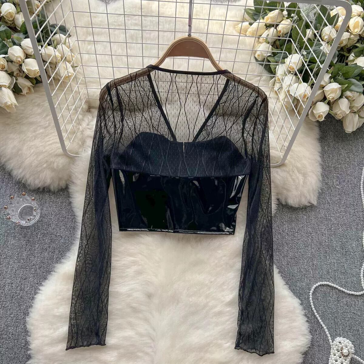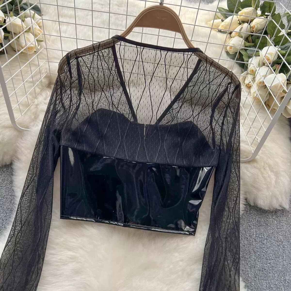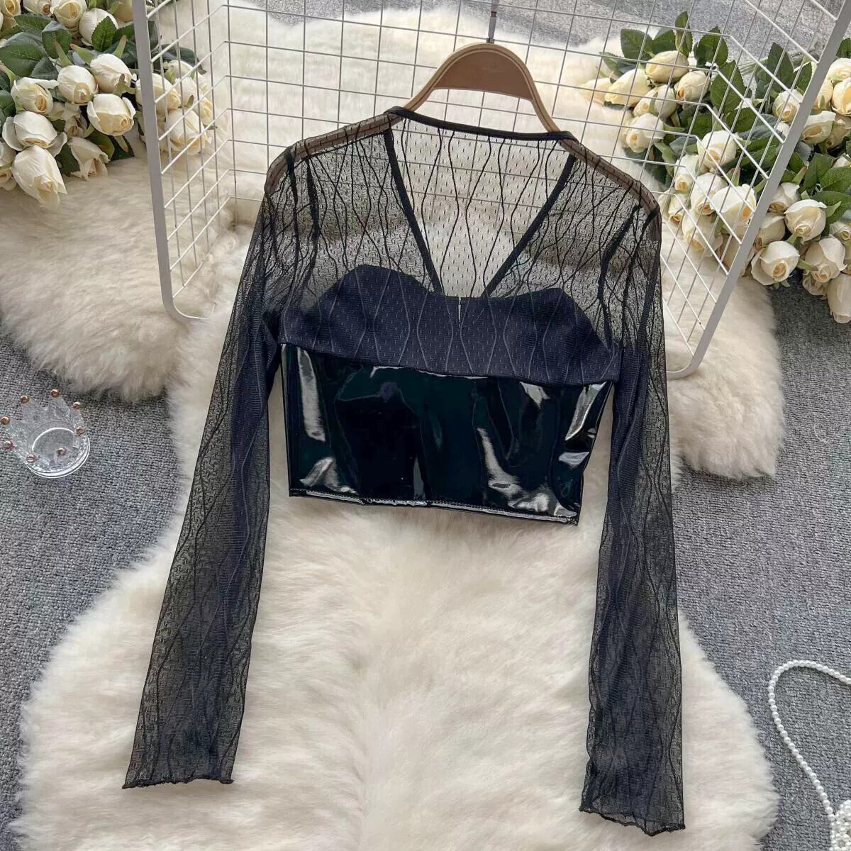 セクシーな中空 V ネックレーススプライシングサテン PU レザー長袖トップス春と夏のタイトなショートトップスの女性 ロング スプリング 春物 サマー 夏物 Vネック lyxaj64479436357