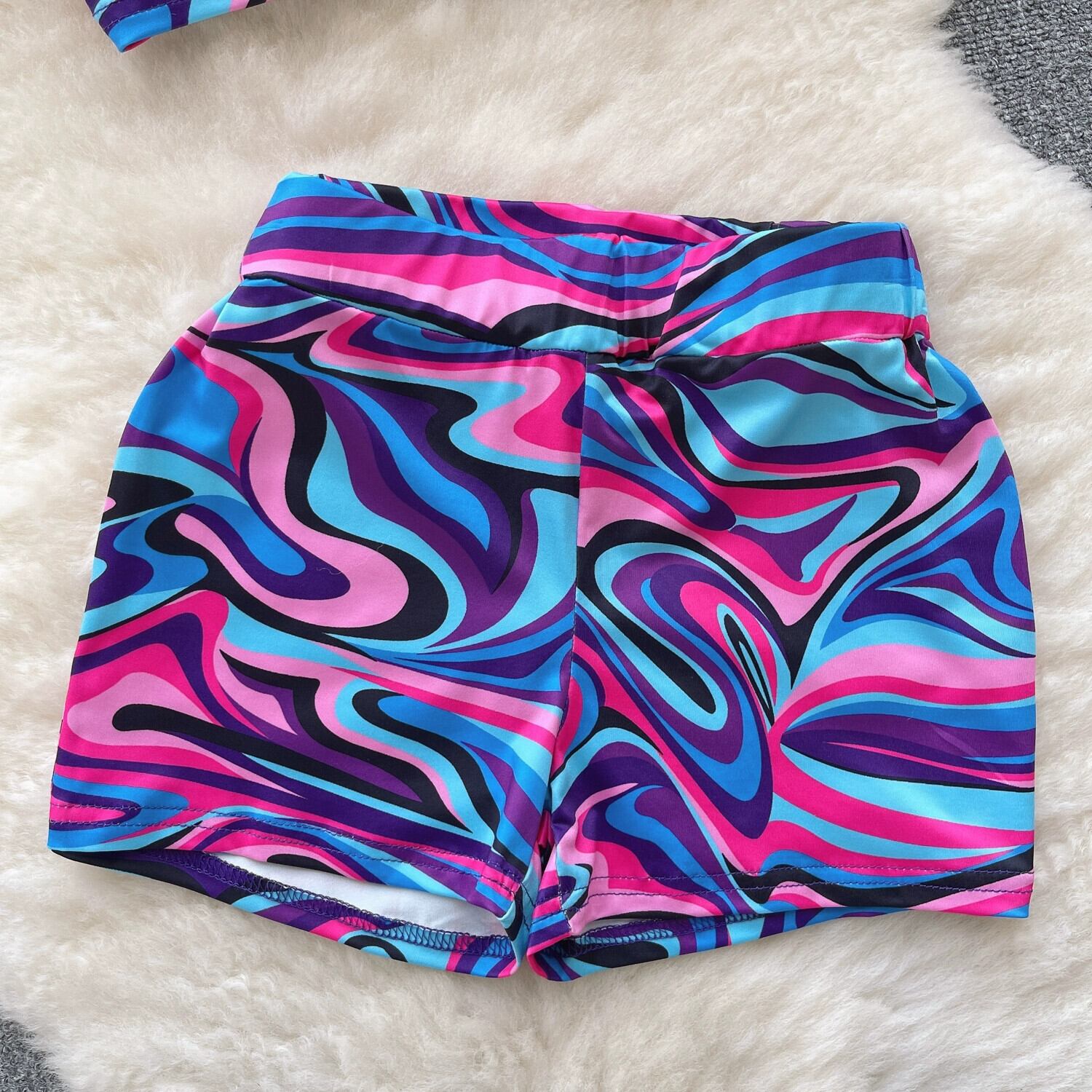 抽象的なプリントの女性用スーツ、アメリカンニッチラウンドネック、へそ出し半袖トップ、ツーピースセット、ハイウエスト痩身タイトショーツ ブルマー Oネック lyxaj78052890433