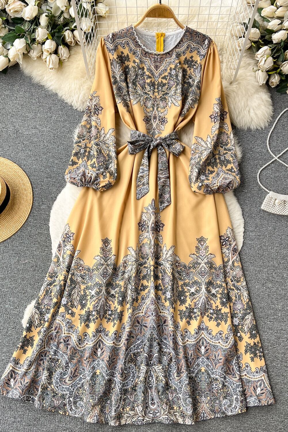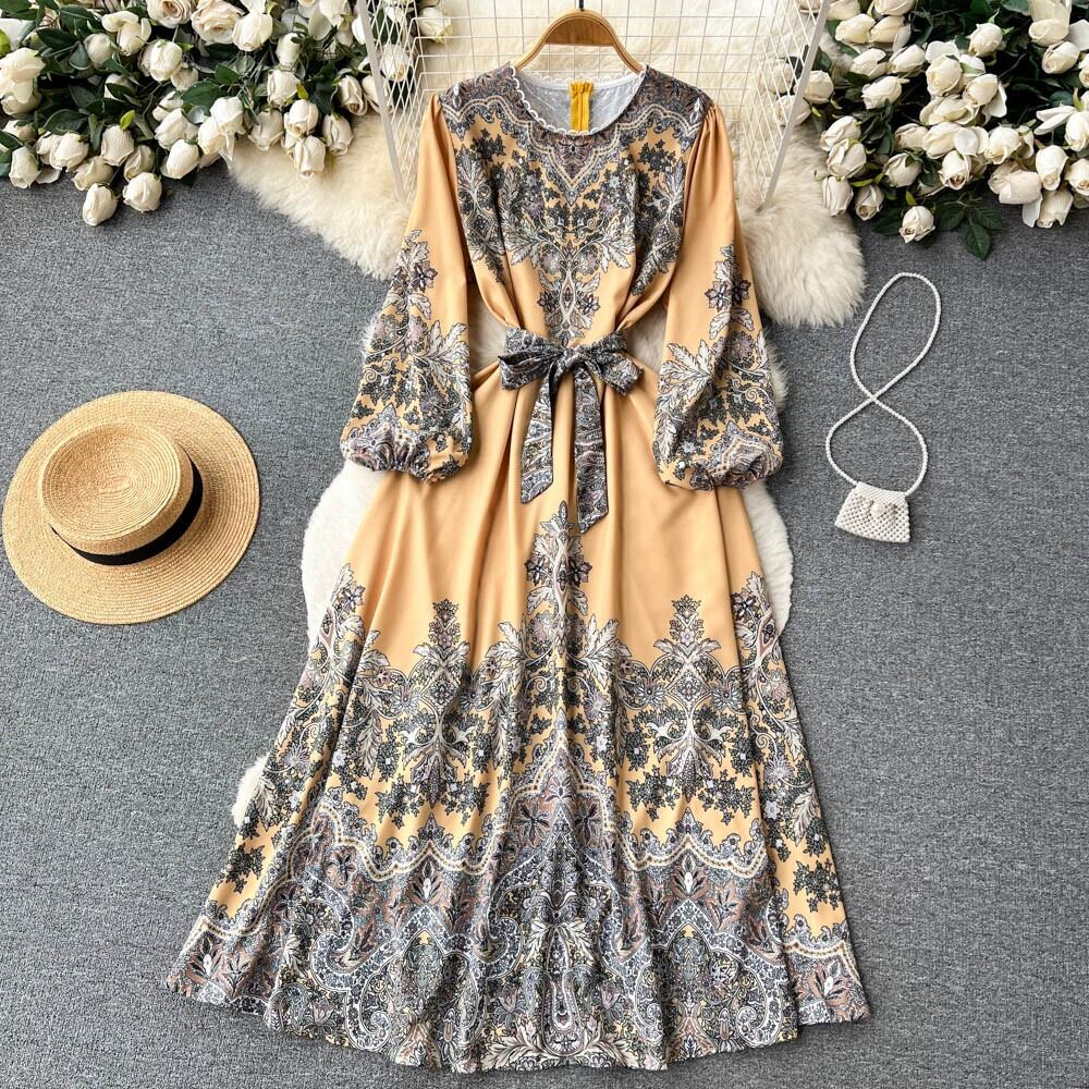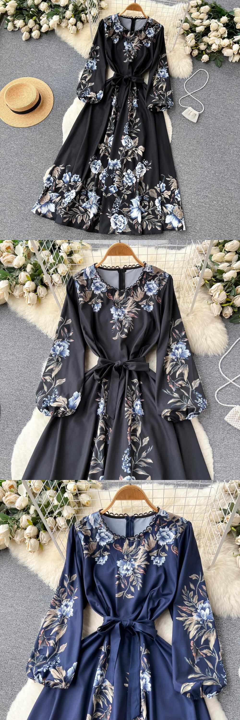 レースアップウエストとエレガントな長袖ポジショニングプリントスカートを備えたフランスのレトロなラウンドネックのハイエンドドレスの女性 ロング Oネック lyxaj96962994917